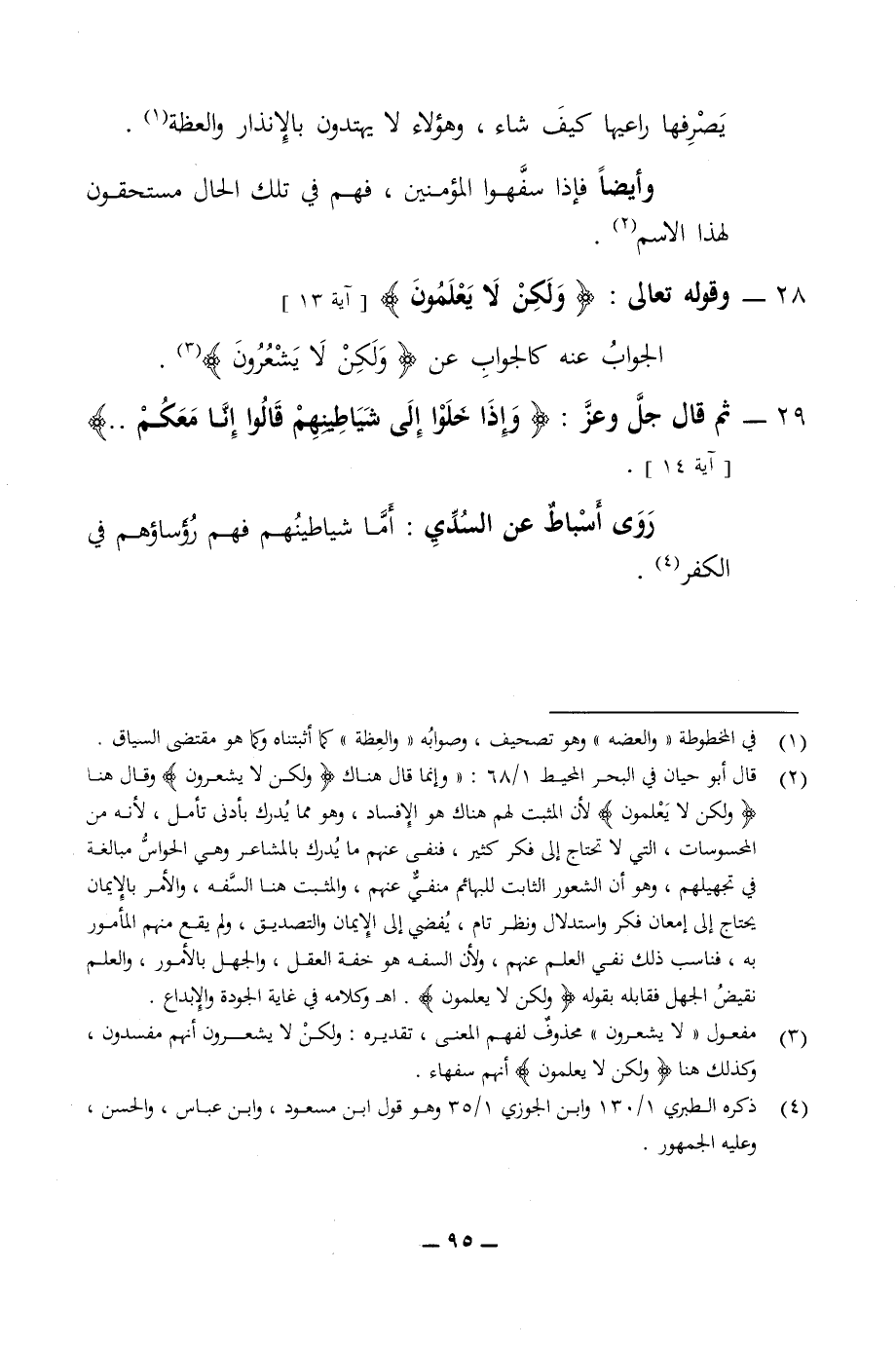 يصرفها راعيها كيف شاء وهؤلاء لا يهتدون بالانذار والعظة وايضا فإذا سفهوا المؤمنين فهم في تلك الحال مستحقون لهذا الاسم 28 - وقوله تعالى ولكن لا يعلمون الجواب عنه كالجواب عن ولكن لا يشعرون 29 - ثم قال جل وعز وإذا خلو الى شياطينهم قالوا انا معكم روى اسباط عن السدي اما شياطينهم فهم رؤساؤهم في الكفر