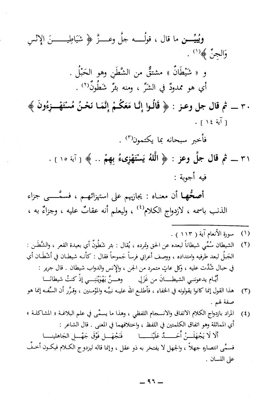 ويبين ما قال قوله جل وعز شياطين الانس والجن وشيطان مشتق من الشطن وهو الحبل أي هو ممدود في الشر ومنه بئر شطون 30 - ثم قال جل وعز قالوا انا معكم انما نحن مستهزءون فاخبر سبحانه بما يكتمون 31 - ثم قال جل وعز الله يستهزئ بهم فيه اجوبه أصحها ان معناه يجازيهم على استهزائهم فسمى جزاء الذنب بأسمه لازدواج الكلام وليعلم انه عقاب عليه وجزاء به