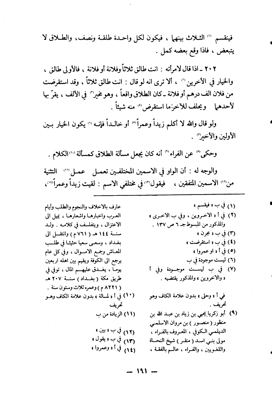 وَحُكِيَ عَنْ الْفَرَّاءِ أَنَّهُ كَانَ يَجْعَلُ مَسْأَلَةَ الطَّلَاقِ كَمَسْأَلَةِ الْكَلَامِ.