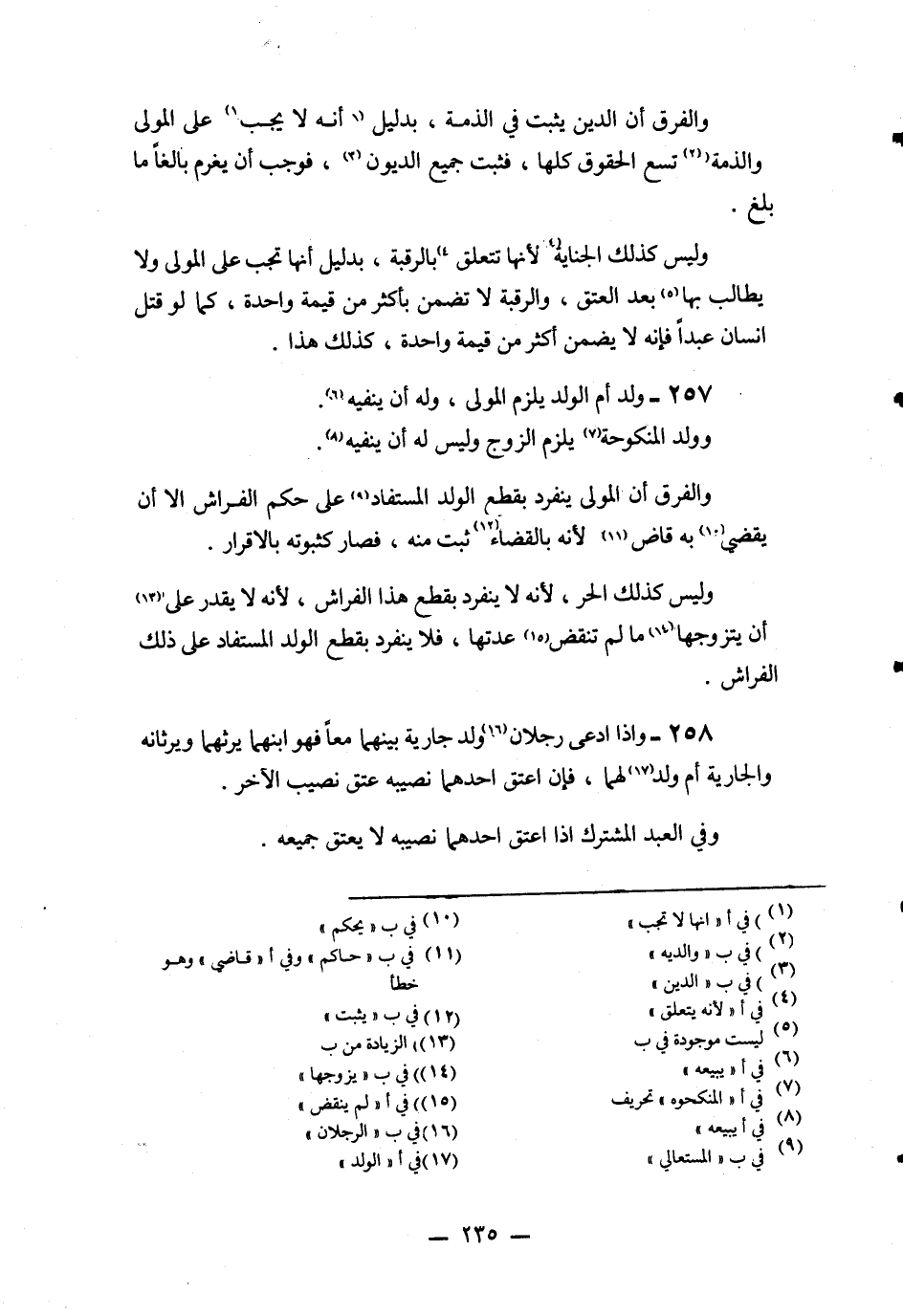 258 - وَإِذَا ادَّعَى رَجُلَانِ وَلَدَ جَارِيَةٍ بَيْنَهُمَا مَعًا فَهُوَ ابْنُهُمَا يَرِثُهُمَا وَيَرِثَانِهِ وَالْجَارِيَةُ أُمُّ وَلَدٍ لَهُمَا، فَإِنْ أَعْتَقَ أَحَدُهُمَا نَصِيبَهُ عَتَقَ نَصِيبُ الْآخَرِ.