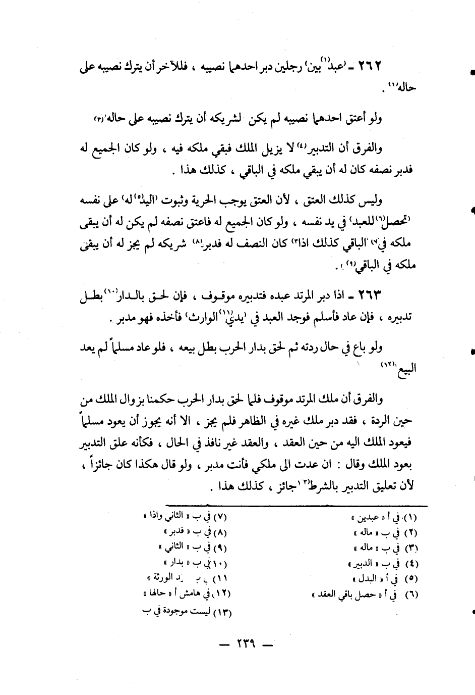 263 - إذَا دَبَّرَ الْمُرْتَدُّ عَبْدَهُ فَتَدْبِيرُهُ مَوْقُوفٌ، فَإِنْ لَحِقَ بِالدَّارِ بَطَلَ تَدْبِيرُهُ، فَإِنْ عَادَ فَأَسْلَمَ فَوُجِدَ الْعَبْدُ فِي يَدَيْ الْوَارِثِ فَأَخَذَهُ فَهُوَ مُدَبَّرٌ.