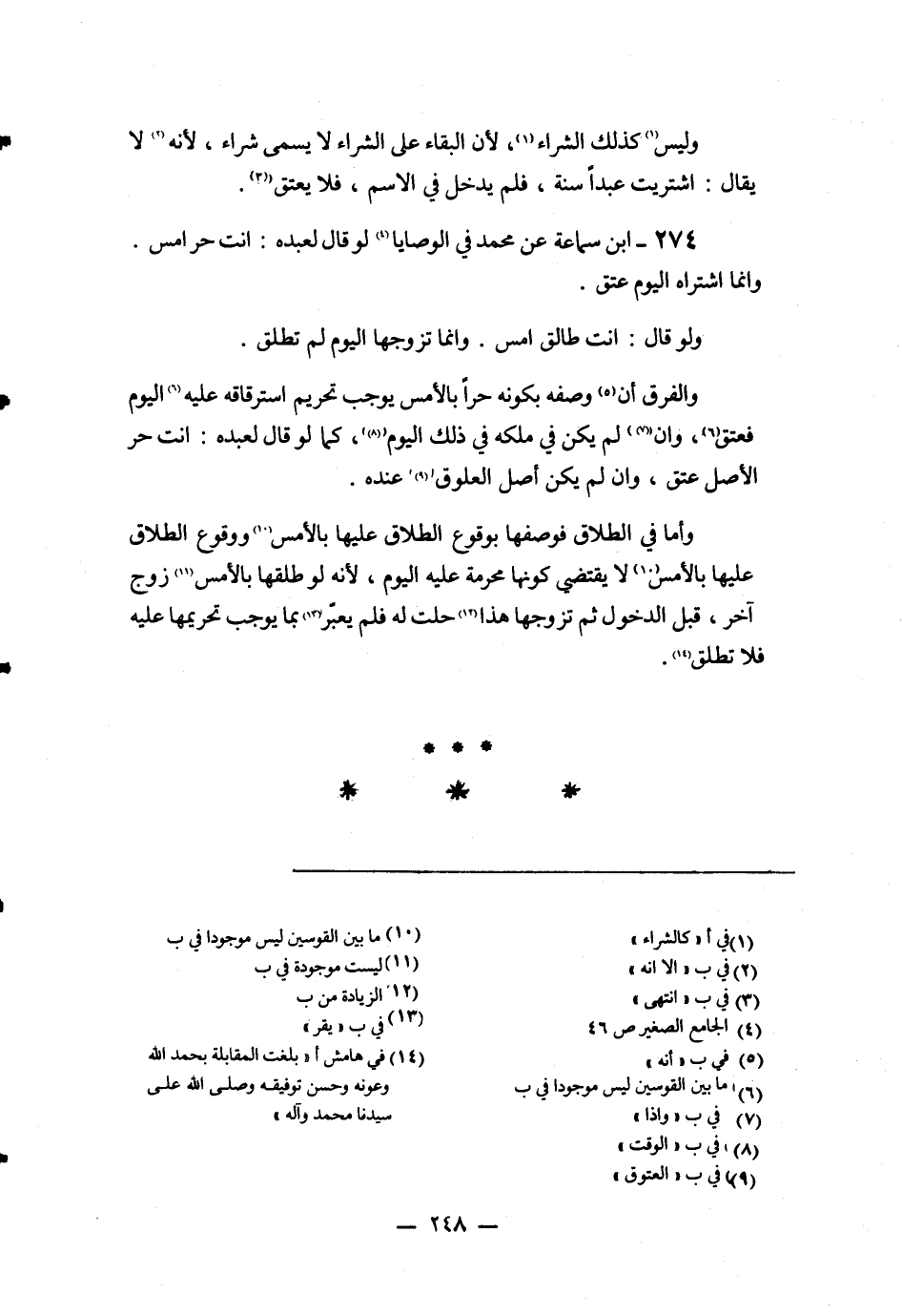 274 - ابْنُ سِمَاعَةَ عَنْ مُحَمَّدٍ فِي الْوَصَايَا لَوْ قَالَ لِعَبْدِهِ: أَنْتَ حُرٌّ أَمْسِ. وَإِنَّمَا اشْتَرَاهُ الْيَوْمَ عَتَقَ.