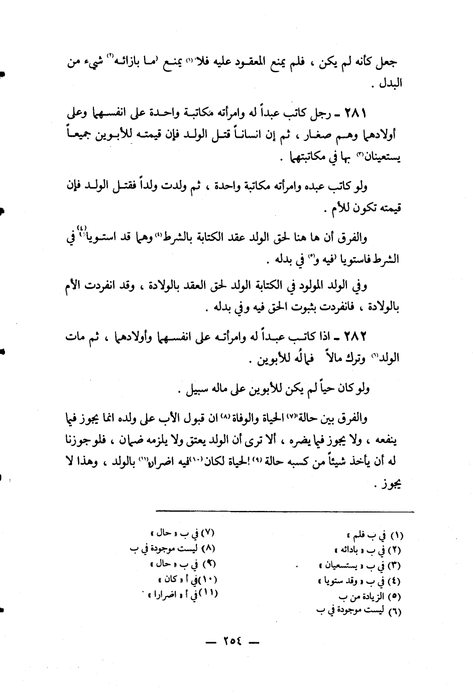 281 - رَجُلٌ كَاتَبَ عَبْدًا لَهُ وَامْرَأَتَهُ مُكَاتَبَةً وَاحِدَةً عَلَى أَنْفُسِهِمَا وَعَلَى أَوْلَادِهِمَا وَهُمْ صِغَارٌ، ثُمَّ إنَّ إنْسَانًا قَتَلَ الْوَلَدَ فَإِنَّ قِيمَتَهُ لِلْأَبَوَيْنِ جَمِيعًا يَسْتَعِينَانِ بِهَا فِي مُكَاتَبَتِهِمَا. وَلَوْ كَاتَبَ عَبْدَهُ وَامْرَأَتَهُ مُكَاتَبَةً وَاحِدَةً، ثُمَّ وَلَدَتْ وَلَدًا فَقُتِلَ الْوَلَدُ فَإِنَّ قِيمَتَهُ تَكُونُ لِلْأُمِّ.