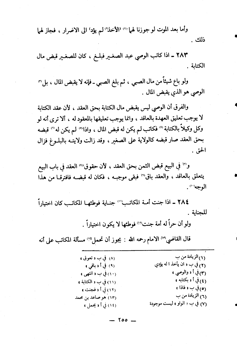 284 - إذَا جَنَتْ أَمَةُ الْمَكَاتِبِ جِنَايَةً فَوَطِئَهَا الْمَكَاتِبُ كَانَ اخْتِيَارًا لِلْجِنَايَةِ. وَلَوْ أَنَّ حُرًّا لَهُ أَمَةٌ جَنَتْ فَوَطِئَهَا لَا يَكُونُ اخْتِيَارًا.