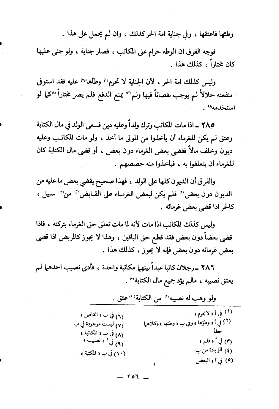 285 - إذَا مَاتَ الْمُكَاتَبُ وَتَرَكَ وَلَدًا وَعَلَيْهِ دَيْنٌ فَسَعَى الْوَلَدُ فِي مَالِ الْكِتَابَةِ وَعَتَقَ لَمْ يَكُنْ لِلْغُرَمَاءِ أَنْ يَأْخُذُوا مِنْ الْمَوْلَى مَا أَخَذَ، وَلَوْ مَاتَ الْمُكَاتَبُ وَعَلَيْهِ دُيُونٌ وَخَلَفَ مَالًا فَقَضَى بَعْضَ الْغُرَمَاءِ دُونَ بَعْضٍ، أَوْ قَضَى مَالَ الْكِتَابَةِ كَانَ لِلْغُرَمَاءِ أَنْ يَتَعَلَّقُوا بِهِ، فَيَأْخُذُوا مِنْهُ حِصَصَهُمْ.