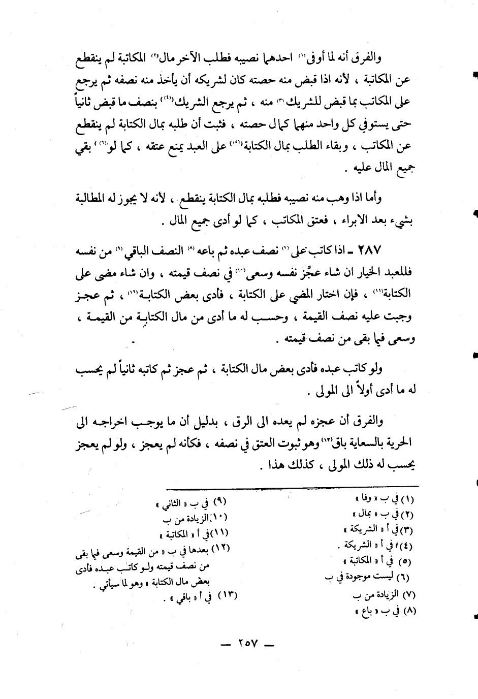 287 - إذَا كَاتَبَ عَلَى نِصْفِ عَبْدِهِ ثُمَّ بَاعَهُ النِّصْفَ الْبَاقِيَ مِنْ نَفْسِهِ فَلِلْعَبْدِ الْخِيَارُ إنْ شَاءَ عَجَّزَ نَفْسَهُ وَسَعَى فِي نِصْفِ قِيمَتِهِ، وَإِنْ شَاءَ مَضَى عَلَى الْكِتَابَةِ، فَإِنْ اخْتَارَ الْمُضِيَّ عَلَى الْكِتَابَةِ، فَأَدَّى بَعْضَ الْكِتَابَةِ، ثُمَّ عَجَزَ وَجَبَتْ عَلَيْهِ نِصْفُ الْقِيمَةِ، وَحُسِبَ لَهُ مَا أَدَّى مِنْ مَالِ الْكِتَابَةِ مِنْ الْقِيمَةِ، وَسَعَى فِيمَا بَقِيَ مِنْ نِصْفِ قِيمَتِهِ.