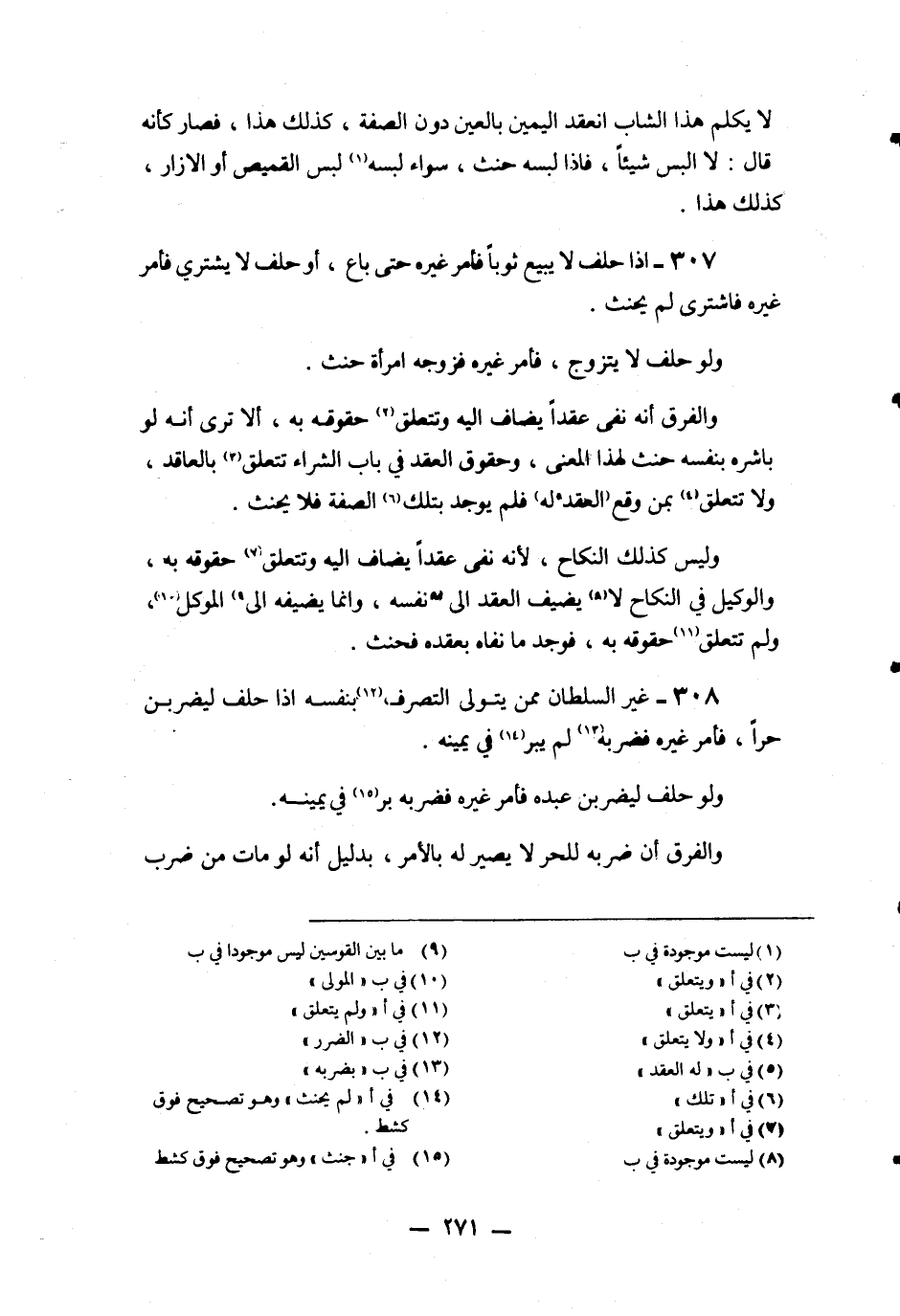 307 - إذَا حَلَفَ لَا يَبِيعُ ثَوْبًا فَأَمَرَ غَيْرَهُ حَتَّى بَاعَ، أَوْ حَلَفَ لَا يَشْتَرِي فَأَمَرَ غَيْرَهُ فَاشْتَرَى لَمْ يَحْنَثْ.