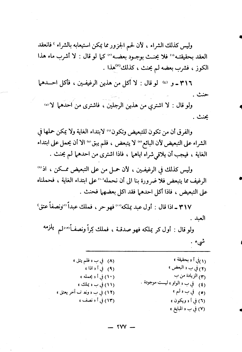 316 - وَلَوْ قَالَ: لَا آكُلُ مِنْ هَذَيْنِ الرَّغِيفَيْنِ، فَأَكَلَ أَحَدَهُمَا حَنِثَ. وَلَوْ قَالَ: لَا أَشْتَرِي مِنْ هَذَيْنِ الرَّجُلَيْنِ، فَاشْتَرَى مِنْ أَحَدِهِمَا لَا يَحْنَثُ.