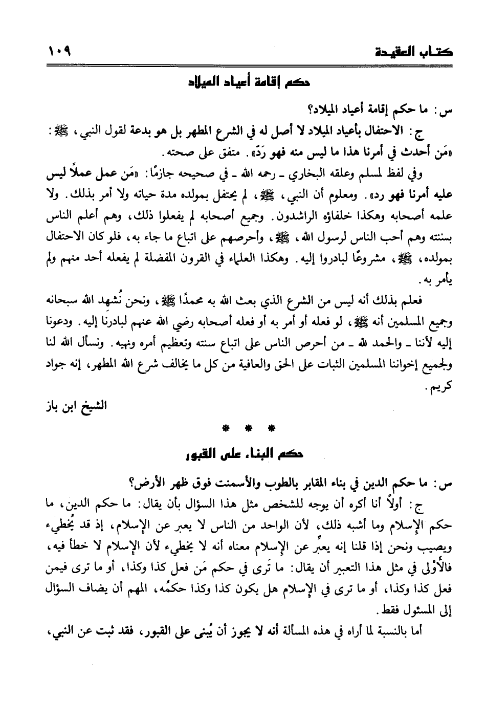 ج الاحتفال بأعياد الميلاد لا أصل له في الشرع المطهر بل هو بدعة لقول النبي صلى الله عليه وسلم " من أحدث في أمرنا هذا ما ليس منه فهو رد ". متفق على صحته. وفي لفظ لمسلم وعلقه البخاري رحمه الله في صحيحه جازما به " من عمل عملا ليس عليه أمرنا فهو رد " ومعلوم أن النبي صلى الله عليه وسلم لم يحتفل بمولده مدة حياته ولا أمر بذلك، ولا علمه أصحابه وهكذا خلفاؤه الراشدون، وجميع أصحابه لم يفعلوا ذلك وهم أعلم الناس بسنته وهم أحب الناس لرسول الله صلى الله عليه وسلم وأحرصهم على اتباع ما جاء به فلو كان الاحتفال بمولده صلى الله عليه وسلم مشروعا لبادروا إليه، وهكذا العلماء في القرون المفضلة لم يفعله أحد منهم ولم يأمر به. فعلم بذلك أنه ليس من الشرع الذي بعث الله به محمدا صلى الله عليه وسلم، ونحن نُشهد الله سبحانه وجميع المسلمين أنه صلى الله عليه وسلم لو فعله أو أمر به أو فعله أصحابه رضي الله عنهم لبادرنا إليه ودعونا إليه. لأننا - والحمد لله - من أحرص الناس على اتباع سنته وتعظيم أمره ونهيه. ونسأل الله لنا ولجميع إخواننا المسلمين الثبات على الحق والعافية من كل ما يخالف شرع الله المطهر إنه جواد كريم.