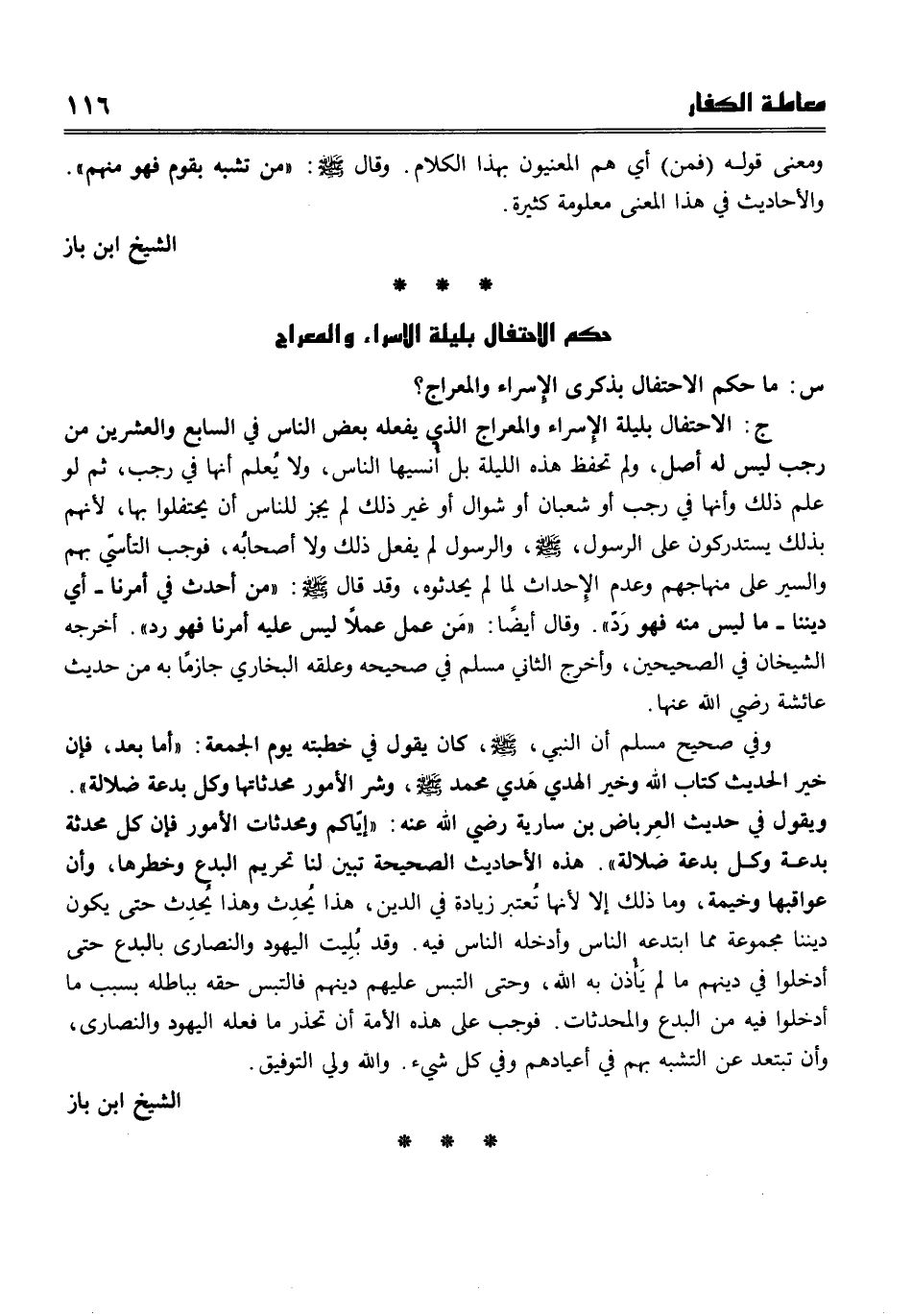 ج الاحتفال بليلة الإسراء والمعراج الذي يفعله بعض الناس في السابع والعشرين من رجب ليس له أصل، ولم تُحفظ هذه الليلة بل أُنسيها الناس، ولا يُعلم أنها في رجب، ثم لو علم ذلك وأنها في رجب أو شعبان أو شوال أو غير ذلك لم يجز للناس أن يحتفلوا بها، لأنهم بذلك يستدركون على الرسول صلى الله عليه وسلم، والرسول لم يفعل ذلك ولا أصحابه، فوجب التأسّي بهم , والسير على مناهجهم وعدم الإحداث لما لم يحدثوه، وقد قال صلى الله عليه وسلم " من أحدث في أمرنا - أي ديننا - ما ليس منه فهو رد ". وقال أيضًا " من عمل عملاً ليس عليه أمرنا فهو رد ". أخرجه الشيخان في الصحيحين، وأخرج الثاني مسلم في صحيحه وعلقه البخاري جازمًا به من حديث عائشة رضي الله عنها. وفي صحيح مسلم أن النبي صلى الله عليه وسلم كان يقول في خطبته يوم الجمعة " أما بعد فإن خير الحديث كتاب الله وخير الهدي هَدي محمد صلى الله عليه وسلم، وشر الأمور محدثاتها وكل بدعة ضلالة ". ويقول في حديث العرباض بن سارية رضي الله عنه " إياكم ومحدثات الأمور فإن كل محدثة بدعة وكل بدعة ضلالة ". هذه الأحاديث الصحيحة تبين لنا تحريم البدع وخطرها، وأن عواقبها وخيمة، وما ذلك إلا لأنها تُعتبر زيادة في الدين، هذا يُحدث وهذا يُحدث حتى يكون ديننا مجموعة مما ابتدعه الناس وأدخله الناس فيه. وقد بُليت اليهود والنصارى بالبدع حتى أدخلوا في دينهم ما لم يأذن به الله، وحتى التبس عليهم دينهم فالتبس حقه بباطله بسبب ما أدخلوا فيه من البدع والمحدثات. فوجب على هذه الأمة أن تحذر ما فعله اليهود والنصارى، وأن تبتعد عن التشبه بهم في أعيادهم وفي كل شيء. والله ولي التوفيق.