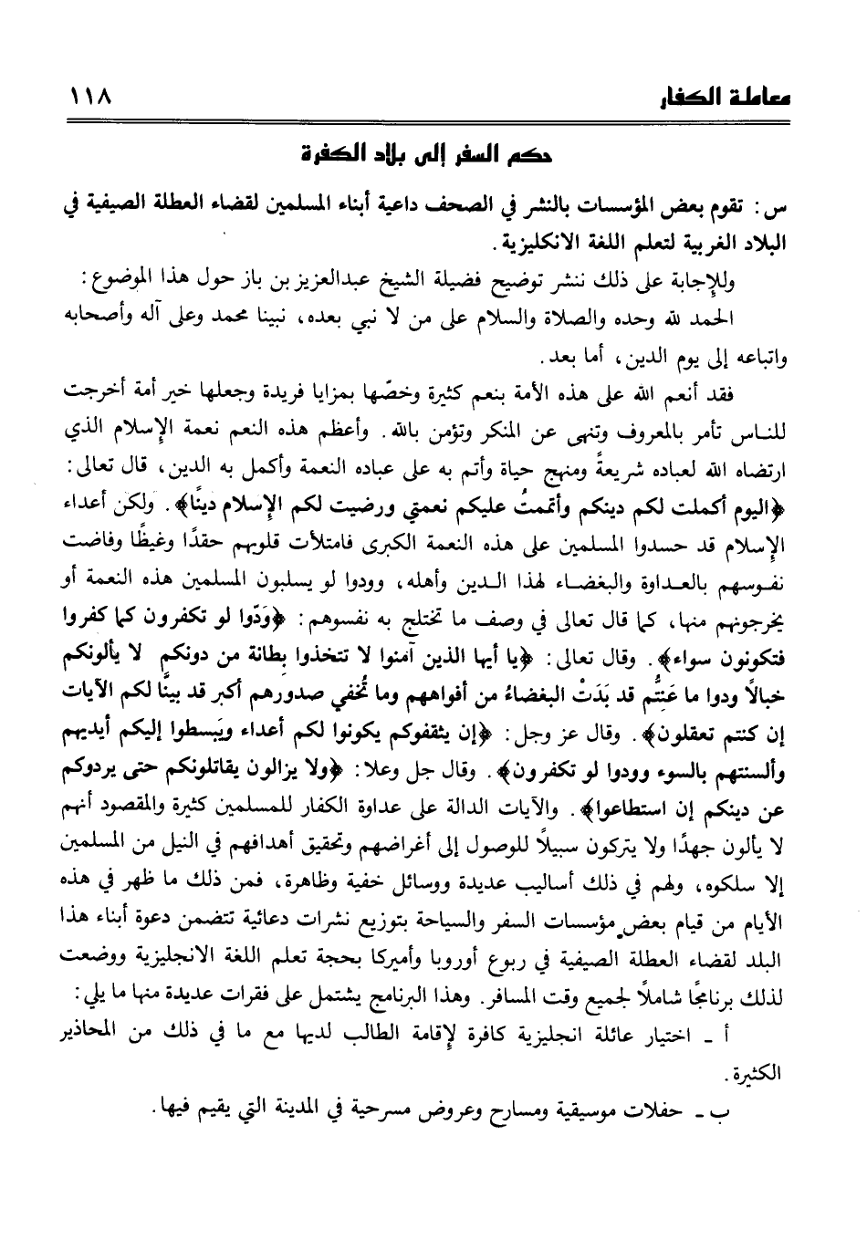 لَوْ تَكْفُرُونَ} . وقال جل وعلا {وَلا يَزَالُونَ يُقَاتِلُونَكُمْ حَتَّى يَرُدُّوكُمْ عَنْ دِينِكُمْ إِنِ اسْتَطَاعُوا} . والآيات الدالة على عداوة الكفار للمسلمين كثيرة. والمقصود أنهم لا يألون جهدا ولا يتركون سبيلا للوصول إلى أغراضهم وتحقيق أهدافهم في النيل من المسلمين إلا سلكوه ولهم في ذلك أساليب عديدة ووسائل خفية وظاهرة، فمن ذلك ما ظهر في هذه الأيام من قيام بعض مؤسسات السفر والسياحة من توزيع نشرات دعائية تتضمن دعوة أبناء هذا البلد لقضاء العطلة الصيفية في ربوع أوربا وأمريكا بحجة تعلم اللغة الإنجليزية، ووضعت لذلك برنامجًا شاملا لجميع وقت المسافر. وهذه البرامج تشتمل على فقرات عديدة منها ما يلي