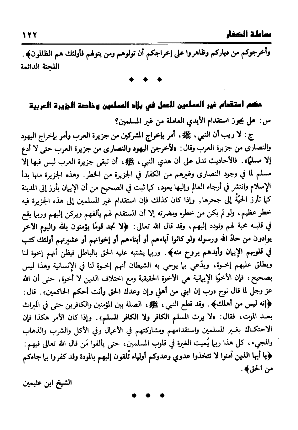 لا ريب أن النبي صلى الله عليه وسلم أمر بإخراج المشركين من جزيرة العرب، وأمر بإخراج اليهود والنصارى من جزيرة العرب وقال " لأخرجن اليهود والنصارى من جزيرة العرب حتى لا أدع إلا مسلماً ". رواه مسلم. فالأحاديث تدل على أن هدي النبي صلى الله عليه وسلم أن تبقى جزيرة العرب ليس فيها إلا مسلم، لما في وجود النصارى وغيرهم من الكفار في الجزيرة من الخطر. وهذه الجزيرة منها بدأ الإسلام، وانتشر في أرجاء العالم، وإليها يعود كما ثبت في الصحيح من أن الإيمان يأرز إلى المدينة كما تأرز الحية إلى جحرها. وإذا كان كذلك فإن استقدام غير المسلمين إلى هذه الجزيرة فيه خطر عظيم، ولو لم يكن من خطره ومضرته إلا أن المستقدِم لهم يألفهم ويركن إليهم، وربما يقع في قلبه محبة لهم وتودد إليهم، وقد قال الله تعالى {لَا تَجِدُ قَوْمًا يُؤْمِنُونَ بِاللَّهِ وَالْيَوْمِ الْآَخِرِ يُوَادُّونَ مَنْ حَادَّ اللَّهَ وَرَسُولَهُ وَلَوْ كَانُوا آَبَاءَهُمْ أَوْ أَبْنَاءَهُمْ أَوْ إِخْوَانَهُمْ أَوْ عَشِيرَتَهُمْ أُولَئِكَ كَتَبَ فِي قُلُوبِهِمُ الْإِيمَانَ وَأَيَّدَهُمْ بِرُوحٍ مِنْهُ} وربما يشتبه عليه الحق بالباطل، فيظن أنهم إخوة لنا، يطلق عليهم إخوة، ويدعي بما يوحي به الشيطان أنهم إخوة لنا في الإنسانية، وهذا ليس بصحيح، فإن الأخوة الإيمانية هي الأخوة الحقيقية، ومع اختلاف الدين لا أخوة، حتى أن الله عز وجل لما قال نوح {رَبِّ إِنَّ ابْنِي مِنْ أَهْلِي وَإِنَّ وَعْدَكَ الْحَقُّ وَأَنْتَ أَحْكَمُ الْحَاكِمِينَ} قال {إِنَّهُ لَيْسَ مِنْ أَهْلِكَ} وقد قطع النبي صلى الله عليه وسلم الصلة بين المؤمنين والكافرين حتى في الميراث بعد الموت، فقال " لا يرث المسلم الكافر ولا الكافر المسلم ". وإذا كان الأمر هكذا فإن الاحتكاك بغير المسلمين واستقدامهم ومشاركتهم في الأعمال، وفي الأكل والشرب، والذهاب والمجيء، كل هذا ربما يميت الغيرة في قلوب المسلمين حتى يألفوا من قال الله تعالى فيهم {يَا أَيُّهَا الَّذِينَ آَمَنُوا لَا تَتَّخِذُوا عَدُوِّي وَعَدُوَّكُمْ أَوْلِيَاءَ تُلْقُونَ إِلَيْهِمْ بِالْمَوَدَّةِ وَقَدْ كَفَرُوا بِمَا جَاءَكُمْ مِنَ الْحَقِّ} .