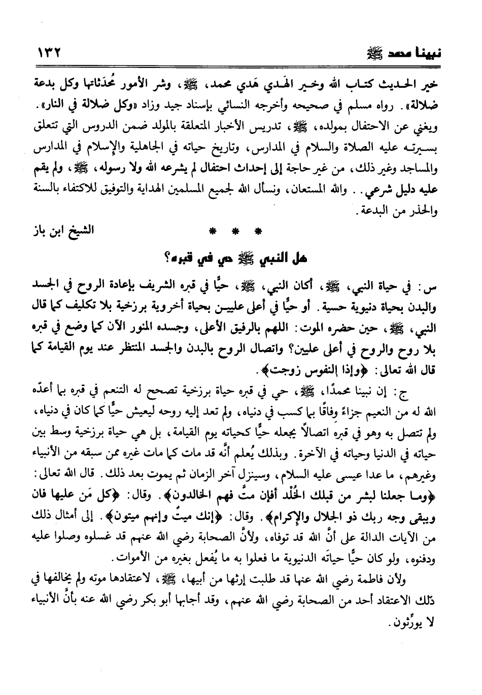 ج إن نبينا محمدًا صلى الله عليه وسلم حي في قبره حياة برزخية يحصل له بها التنعم في قبره بما أعده الله له من النعيم جزاء وِفاقًا له بما كسب في دنياه، ولم تعد إليه روحه ليصير حيا كما كان في دنياه ولم تتصل به وهو في قبره اتصالا يجعله حيا كحياته يوم القيامة، بل هي حياة برزخية وسط بين حياته في الدنيا وحياته في الآخرة، وبذلك يُعلم أنه قد مات، كما مات غيره ممن سبقه من الأنبياء وغيرهم، قال الله تعالى {وَمَا جَعَلْنَا لِبَشَرٍ مِنْ قَبْلِكَ الْخُلْدَ أَفَإِنْ مِتَّ فَهُمُ الْخَالِدُونَ} . وقال {كُلُّ مَنْ عَلَيْهَا فَانٍ. وَيَبْقَى وَجْهُ رَبِّكَ ذُو الْجَلَالِ وَالْإِكْرَامِ} . وقال {إِنَّكَ مَيِّتٌ وَإِنَّهُمْ مَيِّتُونَ} . إلى أمثال ذلك من الآيات الدالة على أن الله قد توفاه؛ ولأن الصحابة رضي الله عنهم قد غسلوه وصلوا عليه ودفنوه، ولو كان حيا حياتَه الدنيوية ما فعلوا به ما يُفعل بغيره من الأموات. ولأن فاطمة رضي الله عنها قد طلبت إرثها من أبيها صلى الله عليه وسلم لاعتقادها بموته، ولم يخالفها في ذلك الاعتقاد أحد من الصحابة رضي الله عنهم، وقد أجابها أبو بكر رضي الله عنه بأن الأنبياء لا يورّثون