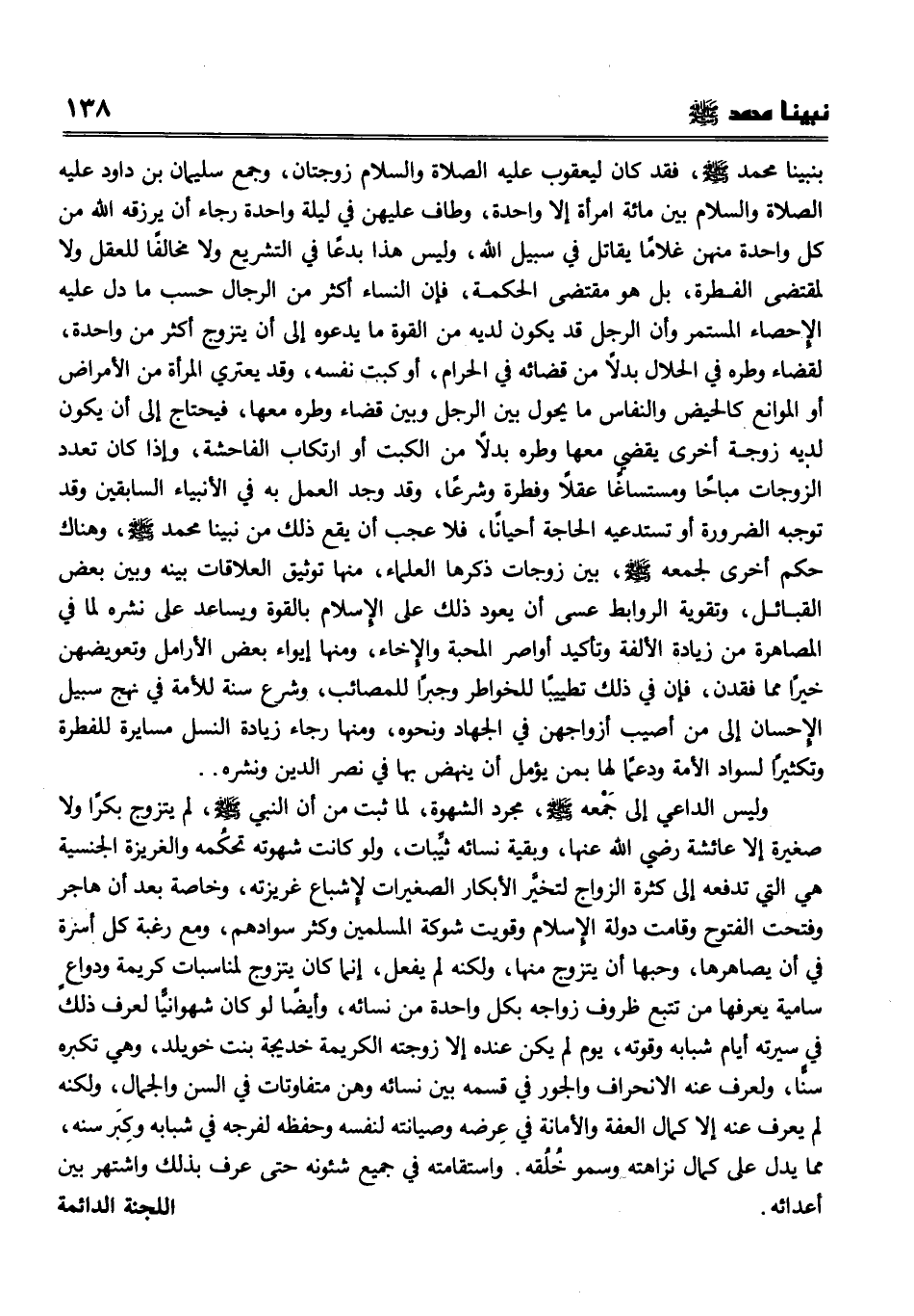 بنبينا محمد صلى الله عليه وسلم، فقد كان ليعقوب عليه الصلاة والسلام زوجتان، وجمع سليمان بن داود عليه الصلاة والسلام بين مائة امرأة إلا واحدة، وطاف بهن في ليلة واحدة رجاء أن يرزقه الله من كل واحدة منهن غلامًا يقاتل في سبيل الله، وليس هذا بدعا في التشريع ولا مخالفا للعقل ولا لمقتضى الفطرة، بل هو مقتضى الحكمة، فإن النساء أكثر من الرجال حسب ما دل عليه الإحصاء المستمر وأن الرجل قد يكون لديه من القوة ما يدعوه إلى أن يتزوج أكثر من واحدة، لقضاء وطره في الحلال بدلاً من قضائه في الحرام، أو كبت نفسه، وقد يعتري المرأة من الأمراض أو الموانع كالحيض والنفاس ما يحول بين الرجل وقضاء وطره معها، فيحتاج إلى أن يكون لديه زوجة أخرى يقضي معها وطره بدلاً من الكبت أو ارتكاب الفاحشة، وإذا كان تعدد الزوجات مباحًا ومستساغًا عقلاً وفطرة وشرعًا، وقد وجد العمل به في الأنبياء السابقين وقد توجبه الضرورة أو تستدعيه الحاجة أحيانًا، فلا عجب أن يقع ذلك من نبينا محمد صلى الله عليه وسلم، وهناك حكم أخرى لجمعه صلى الله عليه وسلم بين زوجات، ذكرها العلماء، منها توثيق العلاقات بينه وبين بعض القبائل، وتقوية الروابط عسى أن يعود ذلك على الإسلام بالقوة ويساعد على نشره لما في المصاهرة من زيادة الألفة وتأكيد أواصر المحبة والإخاء، ومنها إيواء بعض الأرامل وتعويضهن خيرًا مما فقدن، فإن في ذلك تطييبًا للخواطر وجبْرًا للمصائب، وشرع سنة للأمة في نهج سبيل الإحسان إلى من أصيب أزواجهن في الجهاد ونحوه، ومنها رجاء زيادة النسل مسايرة للفطرة وتكثيرًا لسواد الأمة ودعمًا لها بمن يؤمل أن ينهض بها في نصر الدين ونشره.. وليس الداعي إلى جَمْعه صلى الله عليه وسلم، مجرد الشهوة، لما ثبت من أن النبي صلى الله عليه وسلم، لم يتزوج بكرًا ولا صغيرة إلا عائشة رضي الله عنها، وبقية نسائه ثيّبات، ولو كانت شهوته تحكمُه والغريزة الجنسية هي التي تدفعه إلى كثرة الزواج لتخيّر الأبكار الصغيرات لإشباع غريزته، وخاصة بعد أن هاجر وفتحت الفتوحات وقامت دولة الإسلام وقويت شوكة المسلمين وكثر سوادهم، ومع رغبة كل أسرة في أن يصاهرها، وحبها أن يتزوج منها، ولكنه لم يفعل، إنما كان يتزوج لمناسبات كريمة ودواعٍ سامية يعرفها من تتبع ظروف زواجه بكل واحدة من نسائه، وأيضًا لو كان شهوانيًّا لعرف ذلك في سيرته أيام شبابه وقوته، يوم لم يكن عنده إلا زوجته الكريمة خديجة بنت خويلد، وهي تكبره سنًّا، ولعرف عنه الانحراف والجور في قسمه بين نسائه وهن متفاوتات في السن والجمال، ولكنه لم يعرف عنه إلا كمال العفة والأمانة في عِرضه وصيانته لنفسه وحفظه لفرجه في شبابه وكِبَر سنه، مما يدل على كمال نزاهته وسمو خُلُقه. واستقامته في جميع شؤونه حتى عرف بذلك واشتهر بين أعدائه.