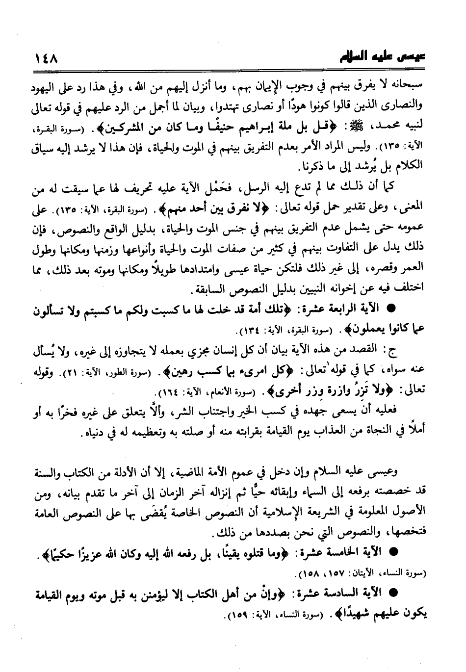 * الآية السادسة عشرة {وَإِنْ مِنْ أَهْلِ الْكِتَابِ إِلَّا لَيُؤْمِنَنَّ بِهِ قَبْلَ مَوْتِهِ وَيَوْمَ الْقِيَامَةِ يَكُونُ عَلَيْهِمْ شَهِيدًا} . (سورة النساء، الآية 159) .