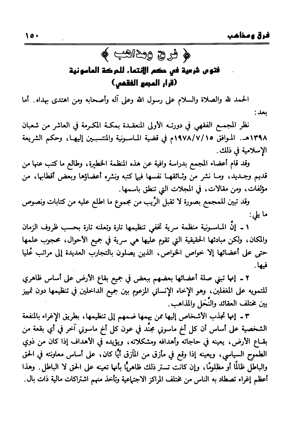 نظر المجمع الفقهي في دورته الأولى المنعقدة بمكة المكرمة في العاشر من شعبان 1398 هـ. الموافق51 7 1978 م في قضية الماسونية والمنتسبين إليها، وحكم الشريعة الإسلامية في ذلك. وقد قام أعضاء المجمع بدراسة وافية عن هذه المنظمة الخطيرة، وطالع ما كتب عنها من قديم وجديد، وما نشر من وثائقها نفسها فيما كتبه ونشره أعضاؤها وبعض أقطابها، من مؤلفات، ومن مقالات، في المجلات التي تنطق باسمها. وقد تبين للمجمع بصورة لا تقبل الرَّيب من مجموع ما اطلع عليه من كتابات ونصوص ما يلي