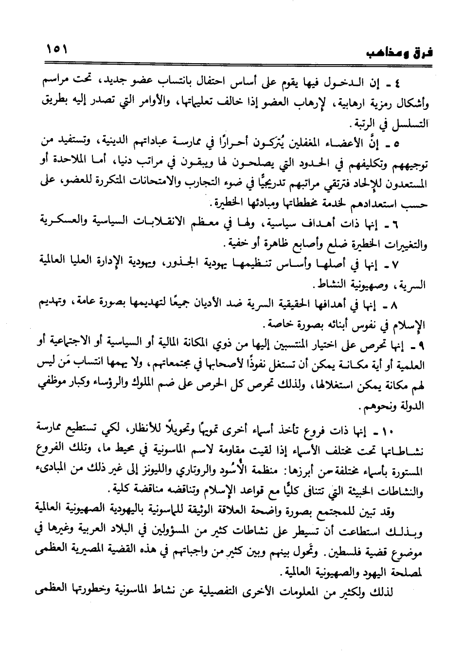 إنها ذات فروع تأخذ أسماء أخرى تمويهًا وتحويلاً للأنظار، لكي تستطيع ممارسة نشاطاتها تحت مختلف الأسماء إذا لقيت مقاومة لاسم الماسونية في محيط ما، وتلك الفروع المستورة بأسماء مختلفة من أبرزها منظمة الأسود والروتاري والليونز إلى غير ذلك من المبادئ والنشاطات الخبيثة التي تتنافى كليًّا مع قواعد الإسلام وتناقضه مناقضة كلية. وقد تبين للمجتمع بصورة واضحة العلاقة الوثيقة للماسونية باليهودية الصهيونية العالمية وبذلك استطاعت أن تسيطر على نشاطات كثير من المسؤولين في البلاد العربية وغيرها في موضوع قضية فلسطين. وتحول بينهم وبين كثير من واجباتهم في هذه القضية المصيرية العظمى لمصلحة اليهود والصهيونية العالمية. لذلك ولكثير من المعلومات الأخرى التفصيلية عن نشاط الماسونية وخطورتها العظمى