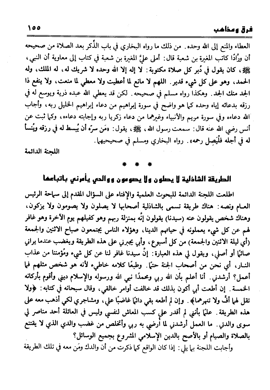 اطلعت اللجنة الدائمة للبحوث العلمية والإفتاء على السؤال المقدم إلى سماحة الرئيس العام، ونصُّه هناك طريقة تسمى بـ الشاذلية أصحابها لا يصلون ولا يصومون ولا يزكون، وهناك شخص يقولون عنه (سيدنا) يقولون إنه بمنزلة ربهم، وهو كفيلهم يوم الآخرة، وهو غافر لهم عن كل شيء يعملونه في حياتهم الدنيا، وهؤلاء الناس يجتمعون صباح الاثنين والجمعة وليلة (أي الاثنين والجمعة) من كل أسبوع، وأبي يجبرني على هذه الطريقة ويغضب عندما يراني صائما أو أصلي، ويقول لي هذه العبارة إن سيدنا غافر لنا عن كل شيء ومُؤمننا من عذاب النار، أي نحن من أصحاب الجنة حتما. وطبعا كلام خاطئ؛ لأنه هو شخص مثلهم، فما أعمل أرشدني. أنا أعلم بأن الله ربي ومحمدا نبي الله ورسوله، والإسلام ديني وأقوم بأركانه الخمسة، إن أطعت أبي أكون بذلك قد خالفت أوامر خالقي، وقال سبحانه في كتابه {فَلَا تَقُلْ لَهُمَا أُفٍّ وَلَا تَنْهَرْهُمَا} . وإن لم أطعه بقي دائما غاضبًا علي، ومشاجري لكي أذهب معه على هذه الطريقة، علما بأنني لا أقدر على كسب المعاش لنفسي وليس في العائلة أحد مناصر لي سوى والدتي، ما العمل أرشدني لكي أرضي به ربي وأتخلص من غضب والدي الذي لا يقتنع بالصلاة والصيام أو بالأصح بالدين الإسلامي المشروع بجميع الوسائل؟