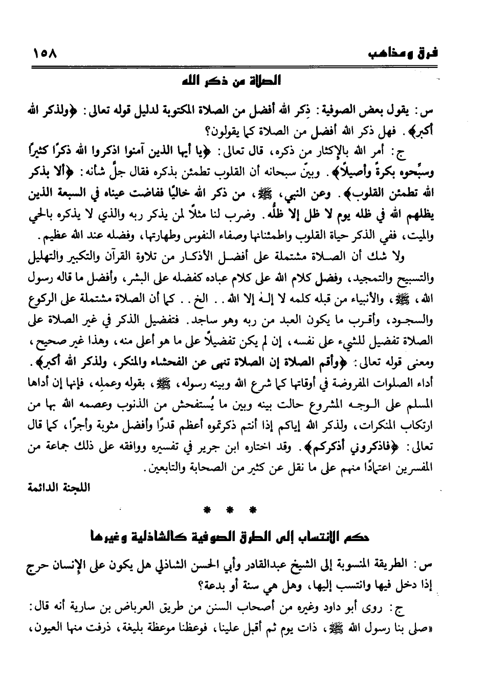 ج أمر الله بالإكثار من ذكره، قال تعالى {يَا أَيُّهَا الَّذِينَ آَمَنُوا اذْكُرُوا اللَّهَ ذِكْرًا كَثِيرًا. وَسَبِّحُوهُ بُكْرَةً وَأَصِيلًا} وبيّن سبحانه أن القلوب تطمئن بذكره، فقال جل شأنه {أَلَا بِذِكْرِ اللَّهِ تَطْمَئِنُّ الْقُلُوبُ} . وعن النبي صلى الله عليه وسلم من ذكر الله خاليًا ففاشت عيناه في السبعة الذين يظلهم الله في ظله يوم لا ظل إلا ظلَّه. وضرب لنا مثلاً لمن يذكر ربه والذي لا يذكره بالحي والميت، ففي الذكر حياة القلوب واطمئنانها وصفاء النفوس وطهارتها، وفضله عند الله عظيم. ولا شك أن الصلاة مشتملة على أفضل الأذكار من تلاوة القرىن والتكبير والتهليل والتسبيح والتمجيد، وفضل كلام الله على كلام عباده كفضله على البشر، وأفضل ما قاله رسول الله صلى الله عليه وسلم، والأنبياء من قبله كلمة لا إله إلا الله.. الخ.. كما أن الصلاة مشتملة على الركوع والسجود، وأقرب ما يكون العبد من ربه وهو ساجد. فتفضيل الذكر في غير الصلاة على الصلاة تفضيل للشيء على نفسه، إن لم يكن تفضيلا على ما هو أعلى منه، وهذا غير صحيح، ومعنى قوله تعالى {وَأَقِمِ الصَّلَاةَ إِنَّ الصَّلَاةَ تَنْهَى عَنِ الْفَحْشَاءِ وَالْمُنْكَرِ وَلَذِكْرُ اللَّهِ أَكْبَرُ} . أداء الصلوات المفروضة في أوقاتها كما شرع الله وبينه رسوله صلى الله عليه وسلم، بقوله وعمله، فإنها إن أداها المسلم على الوجه المشروع حالت بينه وبين ما يُستفحش من الذنوب وعصمه الله بها من ارتكاب المنكرات، ولذكر الله إياكم إذا أنتم ذكرتموه أعظم قدرًا وأفضل مثوبة وأجرًا، كما قال تعالى {فَاذْكُرُونِي أَذْكُرْكُمْ} . وقد اختاره ابن جرير في تفسيره ووافقه على ذلك جماعة من المفسرين اعتماداً منهم على ما نقل عن كثير من الصحابة.
