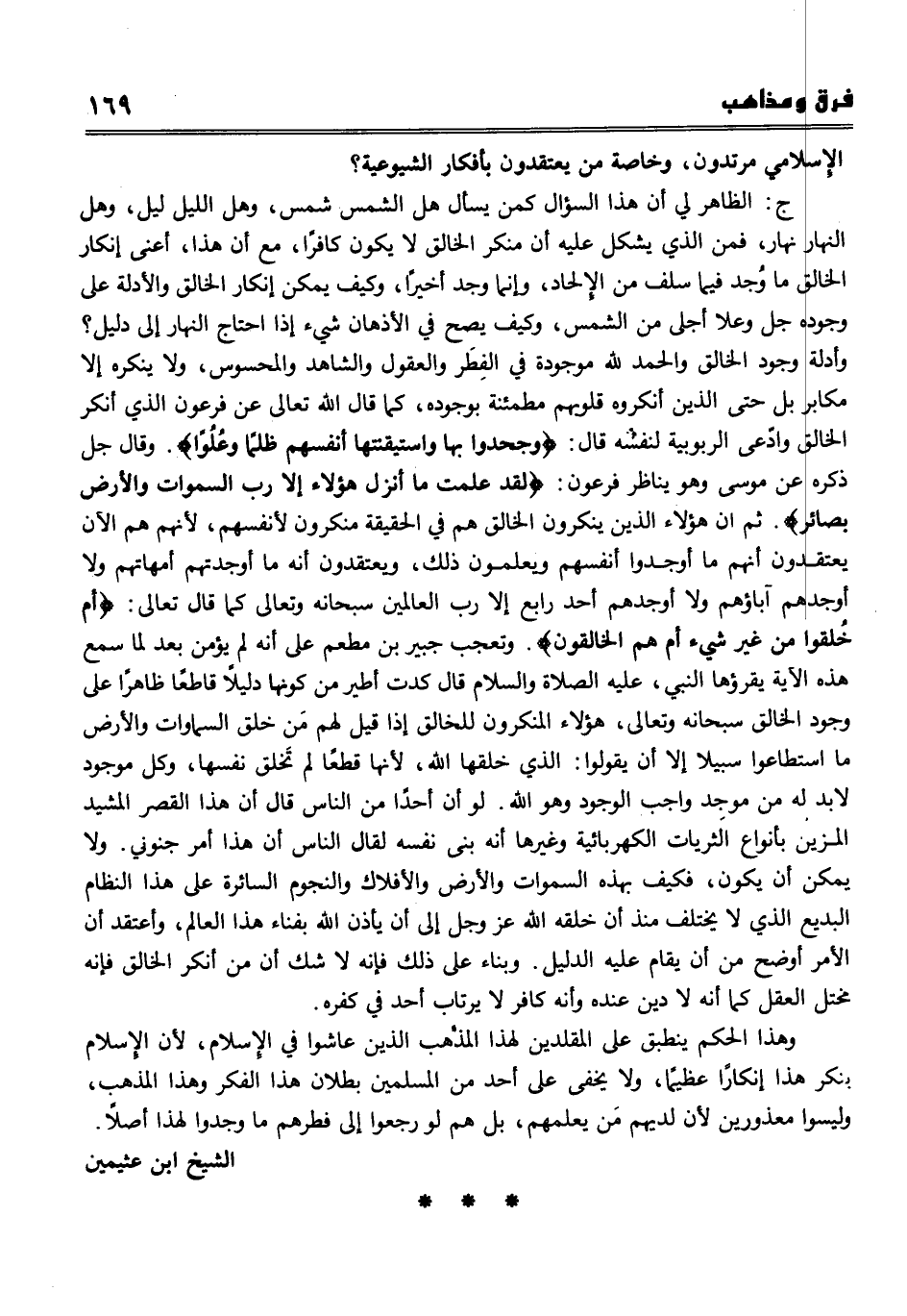 ج الظاهر لي أن هذا السؤال كمن يسأل هل الشمس شمس؟ وهل الليل ليل؟ وهل النهار نهار؟ فمن الذي يشكل عليه أن منكر الخالق لا يكون كافراً، مع أن هذا، أعني إنكار الخالق ما وُجد فيما سلف من الإلحاد، وإنما وجد أخيراً، وكيف يمكن إنكار الخالق والأدلة على وجوده - جل وعلا - أجلى من الشمس. وكيف يصح في الأذهان شيء إذا احتاج النهار إلى دليل؟ وأدلة وجود الخالق والحمد لله موجودة في الفِطَر والعقول، والشاهد والمحسوس، ولا ينكره إلا مكابر بل حتى الذين أنكروه قلوبهم مطمئنة بوجوده، كما قال الله - تعالى - عن فرعون الذي أنكرالخالق وادّضعى الربوبية لنفسه قال {وجحدوا بها واستيقنتها أنفسهم ظلماً وعلواً} . وقال - جل ذكره- عن موسى وهو يناظر فرعون {لقد علمت ما أنزل هؤلاء إلا رب السموات والأرض بصائر} . ثم إن هؤلاء الذين ينكرون الخالق هم في الحقيقة منكرون لأنفسهم، لأنهم هم الآن يعتقدون أنهم ما أوجدوا أنفسهم ويعلمون ذلك، ويعتقدون أنه ما أوجدتهم أمهاتهم، ولا أوجدهم آباؤهم، ولا أوجدهم أحد رابع إلا رب العالمين - سبحانه وتعالى - كما قال تعالى {أم خُلقوا من غير شيء أم هم الخالقون} وتعجب جبير بن مطعم على أنه لم يؤمن بعد أن سمع هذه الآية يقرؤها النبي، عليه الصلاة والسلام، قال "كدت أطير" من كونها دليلاً قاطعاً ظاهراً على وجود الخالق - سبحانه وتعالى -، وهؤلاء المنكرون للخالق إذا قيل لهم مَن خلق السماوات والأرض؟ ما استطاعوا سبيلاً إلا أن يقولوا الذي خلقها الله، لأنها قطعاً لم تَخلق نفسها، وكل موجود لا بد له من موجِد واجب الوجود وهو الله. لو أن أحداً من الناس قال إن هذا القصر المشيد المزين بأنواع الثريات الكهربائية وغيرها إنه بنى نفسه، لقال الناس إن هذا أمر جنوني. ولا يمكن أن يكون، فكيف بهذه السموات والأرض، والأفلاك والنجوم السائرة على هذا النظام البديع الذي لا يختلف منذ أن خلقه الله عز وجل إلى أن يأذن الله بفناء هذا العالم، وأعتقد أن الأمر أوضح من أن يقام عليه الدليل. وبناء على ذلك فإنه لا شك أن من أنكر الخالق فإنه مختل العقل كما أنه لا دين عنده وأنه كافر لا يرتاب أحد في كفره. وهذا الحكم ينطبق على المقلدين لهذا المذهب الذين عاشوا في الإسلام، لأن الإسلام ينكر هذا إنكاراً عظيماً، ولا يخفى على أحد من المسلمين بطلان هذا الفكر وهذا المذهب، وليسوا معذورين لأن لديهم مَن يعلمهم، بل هم لو رجعوا إلى فطرهم ما وجدوا لهذا أصلاً.