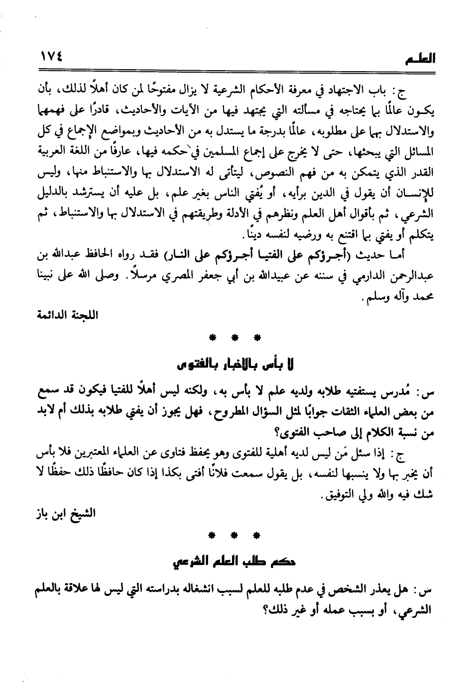 ج باب الاجتهاد في معرفة الأحكام الشرعية لا يزال مفتوحا لمن كان أهلا لذلك، بأن يكون عالما بما يحتاجه في مسألته التي يجتهد فيها، من الآيات والأحاديث، قادرا على فهمهما، والاستدلال بهما على مطلوبه، وعالما بدرجة ما يستدل به من الأحاديث، وبمواضع الإجماع في المسائل التي يبحثها حتى لا يخرج على إجماع المسلمين في حكمه فيها، عارفا من اللغة العربية، القدر الذي يتمكن به من فهم النصوص، ليتأتى له الاستدلال بها، والاستنباط منها، وليس للإنسان أن يقول في الدين برأيه، أو يُفتي الناس بغير علم، بل عليه أن يسترشد بالدليل الشرعي، ثم بأقوال أهل العلم، ونظرهم في الأدلة، وطريقتهم في الاستدلال بها، والاستنباط، ثم يتكلم أو يفتي بما اقتنع به ورضيه لنفسه دينا. أما حديث (أجرؤكم على الفتيا أجرؤكم على النار) فقد رواه الحافظ عبد الله بن عبد الرحمن الدارمي في سننه، عن عبد الله بن أبي جعفر المصري مرسلا. وصلى الله على نبينا محمد وآله وسلم.