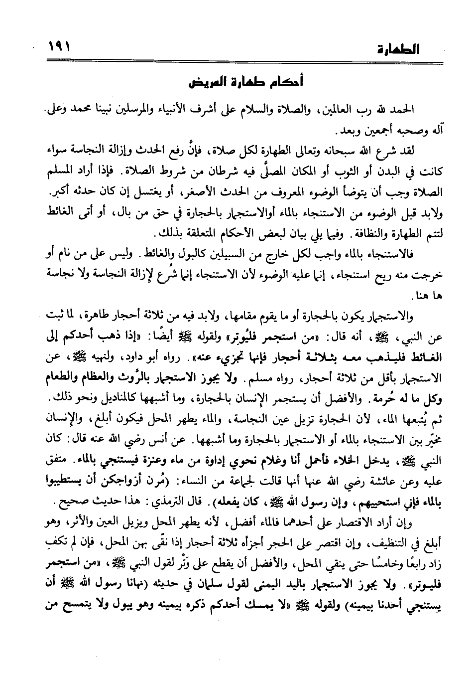 الحمد لله رب العالمين، والصلاة والسلام على أشرف الأنبياء والمرسلين، نبينا محمد وعلى آله وصحبه أجمعين، وبعد لقد شرع الله سبحانه وتعالى الطهارة لكل صلاة، فإن رفع الحدث وإزالة النجاسة سواء كانت في البدن أو الثوب أو المكان المصلى فيه شرطان من شروط الصلاة. فإذا أراد المسلم الصلاة وجب أن يتوضأ الوضوء المعروف من الحدث الأصغر، أو يغتسل إن كان حدثه أكبر، ولا بد قبل الوضوء من الاستنجاء بالماء أو الاستجمار بالحجارة في حق من بال أو أتى الغائط لتتم الطهارة والنظافة، وفيما يلي بيان لبعض الأحكام المتعلقة بذلك
