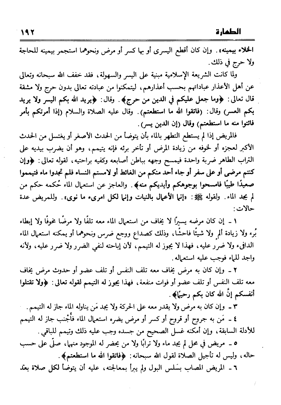 الخلاء بيمينه ". وإن كان أقطع اليسرى أو بها كسر أو مرض ونحوهما، استجمر بيمينه للحاجة ولا حرج في ذلك، ولما كانت الشريعة الإسلامية مبنية على اليسر والسهولة، خفف الله سبحانه وتعالى عن أهل الأعذار عباداتهم بحسب أعذارهم ليتمكنوا من عبادته تعالى بدون حرج ولا مشقة، قال تعالى {وَمَا جَعَلَ عَلَيْكُمْ فِي الدِّينِ مِنْ حَرَجٍ} وقال {يُرِيدُ اللَّهُ بِكُمُ الْيُسْرَ وَلا يُرِيدُ بِكُمُ الْعُسْرَ} وقال {فَاتَّقُوا اللَّهَ مَا اسْتَطَعْتُمْ} وقال عليه الصلاة والسلام " إذا أمرتكم بأمر فأتوا منه ما استطعتم "، وقال " إن الدين يسر ". فالمريض إذا لم يستطع التطهر بالماء بأن يتوضأ من الحدث الأصغر أو يغتسل من الحدث الأكبر لعجزه أو لخوفه من زيادة المرض أو تأخر برئه، فإنه يتيمم وهو أن يضرب بيديه على التراب الطاهر ضربة واحدة، فيمسح وجهه بباطن أصابعه وكفيه براحتيه لقوله تعالى {وَإِنْ كُنْتُمْ مَرْضَى أَوْ عَلَى سَفَرٍ أَوْ جَاءَ أَحَدٌ مِنْكُمْ مِنَ الْغَائِطِ أَوْ لامَسْتُمُ النِّسَاءَ فَلَمْ تَجِدُوا مَاءً فَتَيَمَّمُوا صَعِيدًا طَيِّبًا فَامْسَحُوا بِوُجُوهِكُمْ وَأَيْدِيكُمْ مِنْهُ} ولقوله صلى الله عليه وسلم " إنما الأعمال بالنيات وإنما لكل امرئ ما نوى ". وللمريض عدة حالات