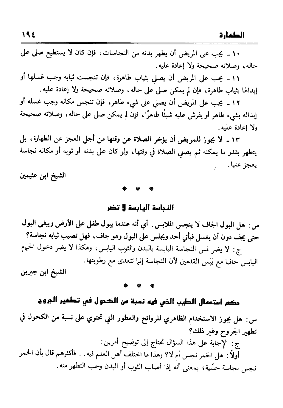 13- لا يجوز للمريض أن يؤخر الصلاة عن وقتها من أجل العجز عن الطهارة، بل يتطهر بقدر ما يمكنه من ثمُ يصلي الصلاة في وقتها، ولو كان على بدنه وثوبه أو مكانه نجاسة يعجز عنها.