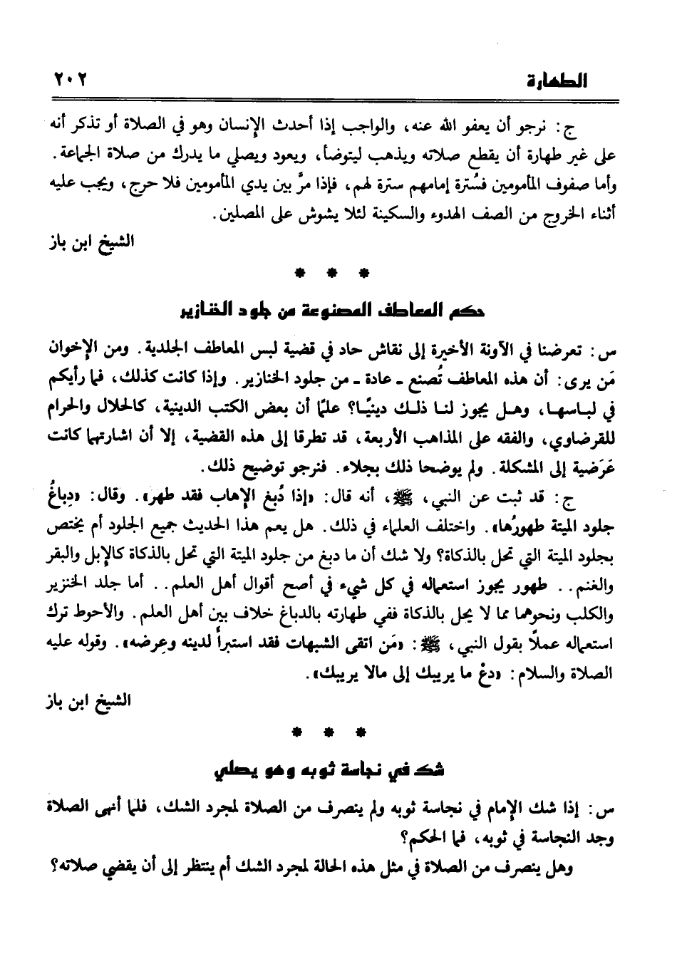 جـ قد ثبت عن النبي صلى الله عليه وسلم أنه قال " إذا دبغ الإهاب فقد طهر "، وقال " دباغ جلود الميتة طهورها "، واختلف العلماء في ذلك، هل يعم هذا الحديث جميع الجلود أم يختص بجلود الميتة التي تحل بالذكاة، ولا شك أن ما دبغ من جلود الميتة التي تحل بالذكاة كالإبل والبقر والغنم طهور يجوز استعماله في كل شيء في أصح أقوال أهل العلم.. أما جلد الخنزير والكلب ونحوهما مما لا يحل بالذكاة ففي طهارته بالدباغ خلاف بين أهل العلم؛ والأحوط ترك استعماله، عملا بقول النبي صلى الله عليه وسلم " ومن اتقى الشبهات فقد استبرأ لدينه وعرضه " وقوله عليه الصلاة والسلام " دع ما يريبك إلى ما لا يريبك ".