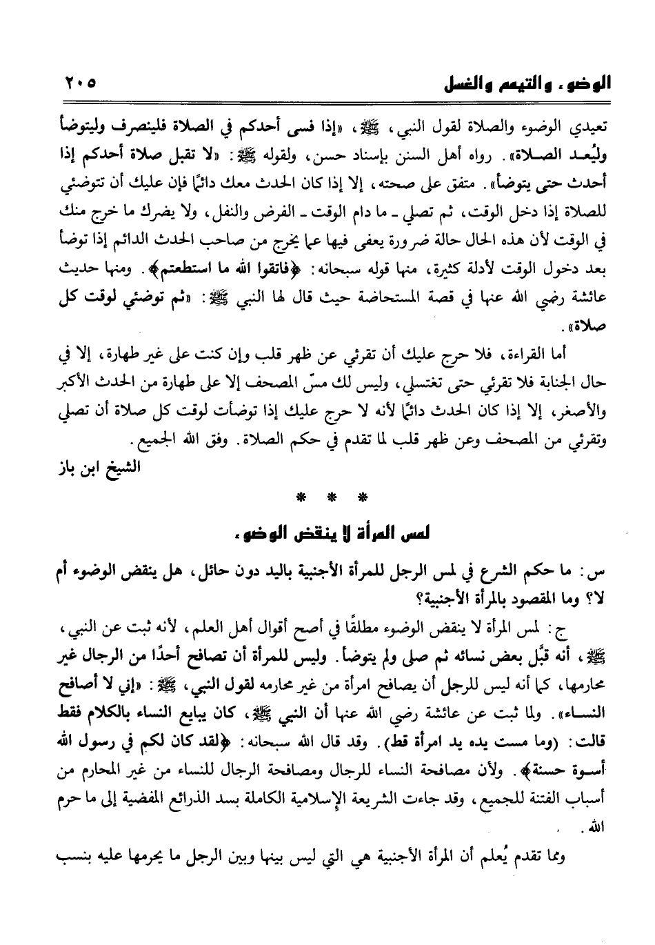 ج لمس المرأة لا ينقض الوضوء مطلقًا في أصح أقوال أهل العلم؛ لأنه ثبت عن النبي صلى الله عليه وسلم أنه قبّل بعض نسائه ثم صلى ولم يتوضأ. وليس للمرأة أن تصافح أحدا من الرجال غير محارمها، كما أنه ليس للرجل أن يصافح امرأة من غير محارمه، لقول النبي صلى الله عليه وسلم " إني لا أصافح النساء "، ولما ثبت عن عائشة رضي الله عنها أن النبي صلى الله عليه وسلم كان يبايع النساء بالكلام فقط قالت (وما مست يده يد امرأة قط) . وقد قال الله سبحانه {لَقَدْ كَانَ لَكُمْ فِي رَسُولِ اللَّهِ أُسْوَةٌ حَسَنَةٌ} ، ولأن مصافحة النساء للرجال ومصافحة الرجال للنساء من غير المحارم من أسباب الفتنة للجميع، وقد جاءت الشريعة الإسلامية الكاملة بسد الذرائع المفضية إلى ما حرم الله. ومما تقدم يعلم أن المرأة الأجنبية هي التي ليس بينها وبين الرجل ما يحرمها عليه بنسب