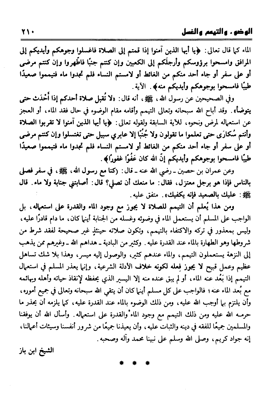 فالواجب على كل مسلم أينما كان أن يتقي الله سبحانه في جميع أموره، وأن يلتزم بما أوجب الله عليه، ومن ذلك الوضوء بالماء عند القدرة عليه، كما يلزمه أن يحذر ما حرمه الله، ومن ذلك التيمم مع وجود الماء والقدرة على استعماله. وأسأل الله أن يوفقنا والمسلمين جميعا للفقه في دينه والثبات عليه، وأن يعيذنا جميعا من شرور أنفسنا وسيئات أعمالنا. إنه جواد كريم، وصلى الله على نبينا محمد، وآله وصحبه.