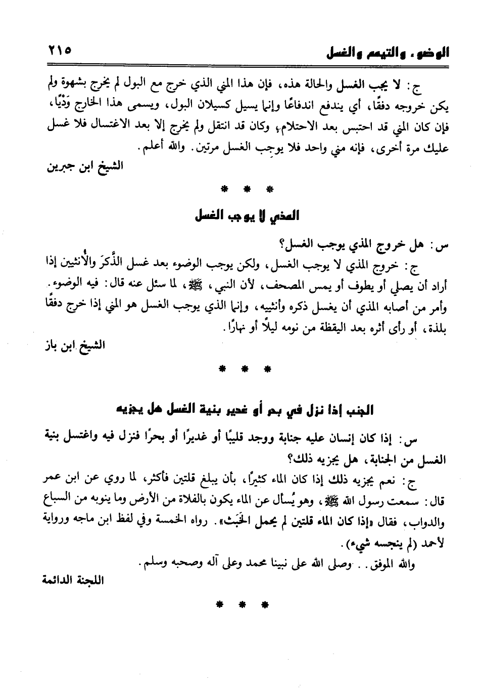 ج خروج المذي لا يوجب الغسل، ولكن يوجب الوضوء بعد غسل الذكر والأنثيين إذا أراد أن يصلي أو يطوف أو يمس المصحف؛ لأن النبي صلى الله عليه وسلم لما سئل عنه قال فيه الوضوء وأمر من أصابه المذي أن يغسل ذكره وأنثييه. وإنما الذي يوجب الغسل هو المني، إذا خرج دفقا بلذة، أو رأى أثره بعد اليقظة من نومه ليلا أو نهارا.