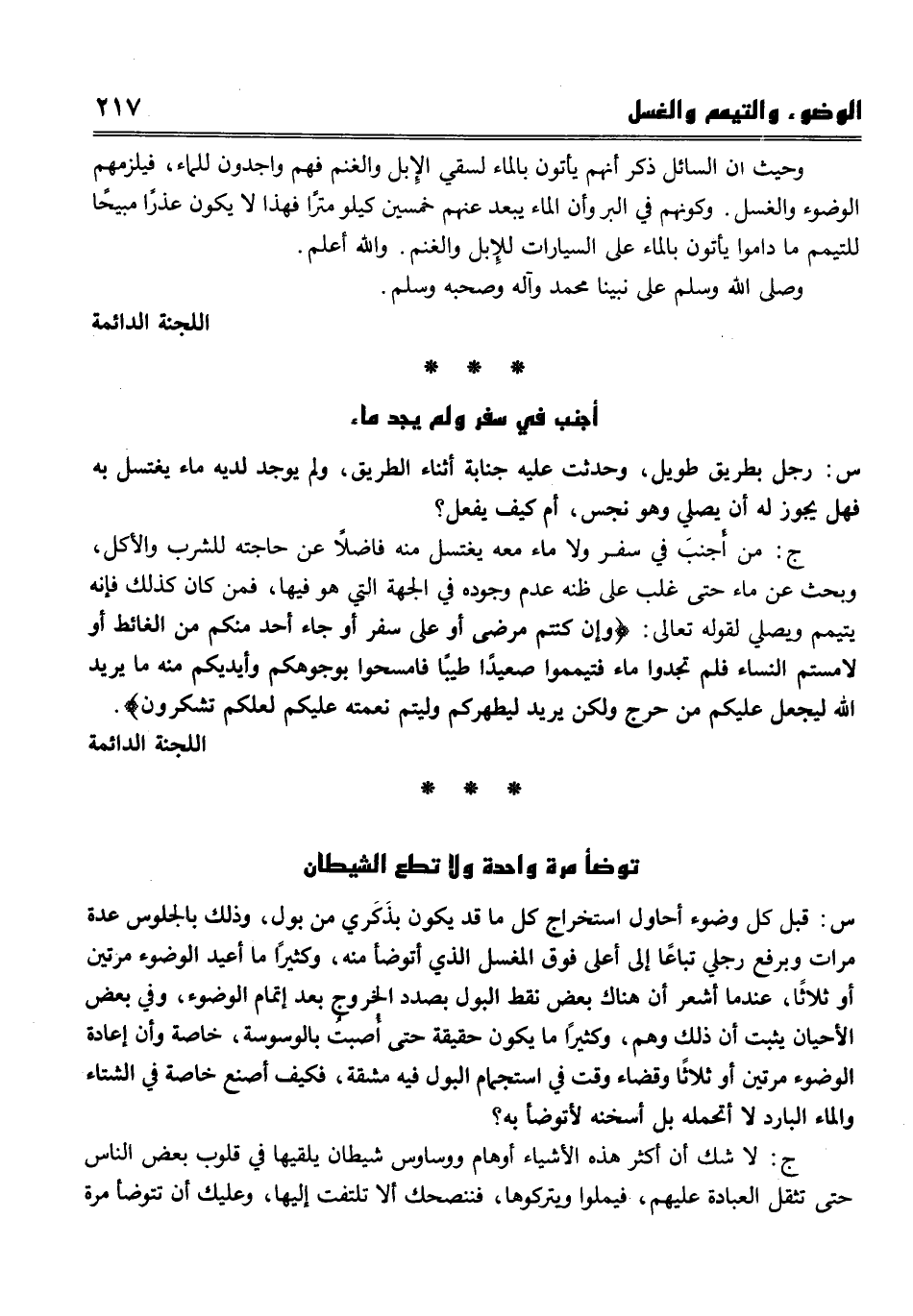 ج من أجنب في سفر ولا ماء معه يغتسل منه فاضلاً عن حاجته للشرب والأكل، وبحث عن ماءٍ حتى بلغ على ظنه عدم وجوده في الجهة التي هو فيها، فمن كان كذلك فإنه يتيمم ويصلي لقوله تعالى {وَإِنْ كُنْتُمْ مَرْضَى أَوْ عَلَى سَفَرٍ أَوْ جَاءَ أَحَدٌ مِنْكُمْ مِنَ الْغَائِطِ أَوْ لَامَسْتُمُ النِّسَاءَ فَلَمْ تَجِدُوا مَاءً فَتَيَمَّمُوا صَعِيدًا طَيِّبًا فَامْسَحُوا بِوُجُوهِكُمْ وَأَيْدِيكُمْ مِنْهُ مَا يُرِيدُ اللَّهُ لِيَجْعَلَ عَلَيْكُمْ مِنْ حَرَجٍ وَلَكِنْ يُرِيدُ لِيُطَهِّرَكُمْ وَلِيُتِمَّ نِعْمَتَهُ عَلَيْكُمْ لَعَلَّكُمْ تَشْكُرُونَ} .