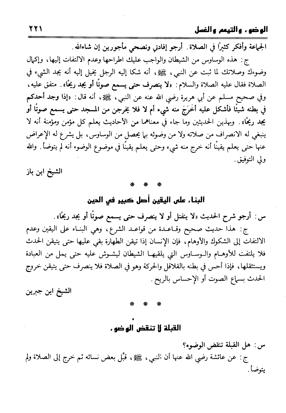 ج هذا حديث صحيح وقاعدة من قواعد الشرع، وهي البناء على اليقين وعدم الالتفات الى الشكوك والأوهام، فإن الانسان إذا تيقن الطهارة بقي عليها حتى يتيقن الحدث فلا يلتفت للاوهام والوساوس التي يلقيها الشيطان ليشوش عليه حتي يمل من العبادة ويستثقلها، فإذا أحس في بطنه بالقلاقل والحركة وهو في الصلاة فلا ينصرف حتى يتيقن خروج الحدث بسماع الصوت أو الإحساس بالريح.