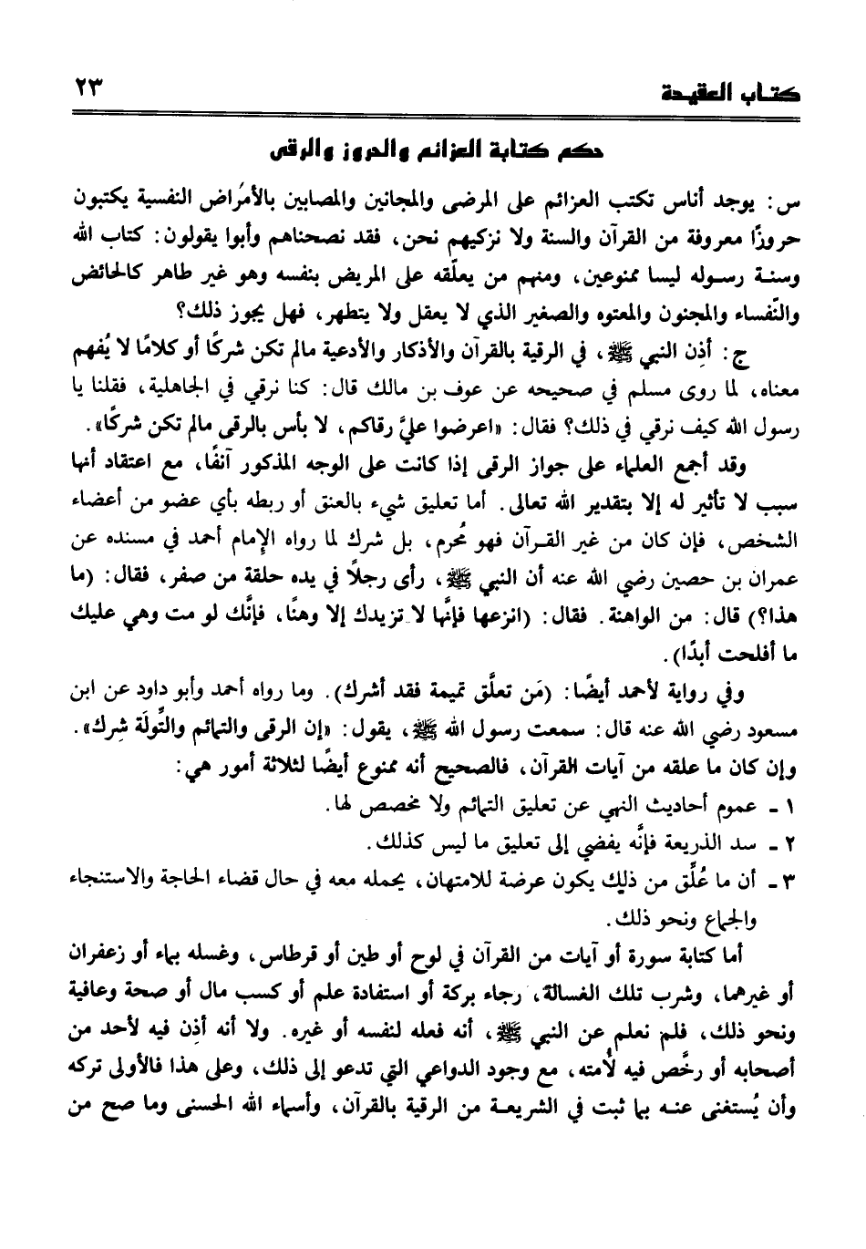 وقد أجمع العلماء على جواز الرقى إذا كانت على الوجه المذكور آنفاً، مع اعتقاد أنها سبب لا تأثير له إلا بتقدير الله تعالى. أما تعليق شيء بالعنق أو ربطه بأي عضو من أعضاء الشخص، فإن كان من غير القرآن فهو محرم، بل شرك لما رواه الإمام أحمد في مسنده عن عمران بن حصين رضي الله عنه أن النبي صلى الله عليه وسلم رأى رجلاً في يده حلقة من صفر، فقال " ما هذا؟ " قال من الواهنة. فقال " انزعها فإنها لاتزيدك إلا وهناً، فإنك لو مت وهي عليك ما أفلحت أبداً ". وفي رواية لأحمد أيضاً " مِن تعلّق تميمة فقد أشرك ". وما رواه أحمد وأبو داود عن ابن مسعود رضي الله عنه قال سمعت رسول الله صلى الله عليه وسلم، يقول " إن الرقى والتمائم والتولة شرك ". وإن كان ما علقه من آيات القرآن، فالصحيح أنه ممنوع أيضاً لثلاثة أمور هي