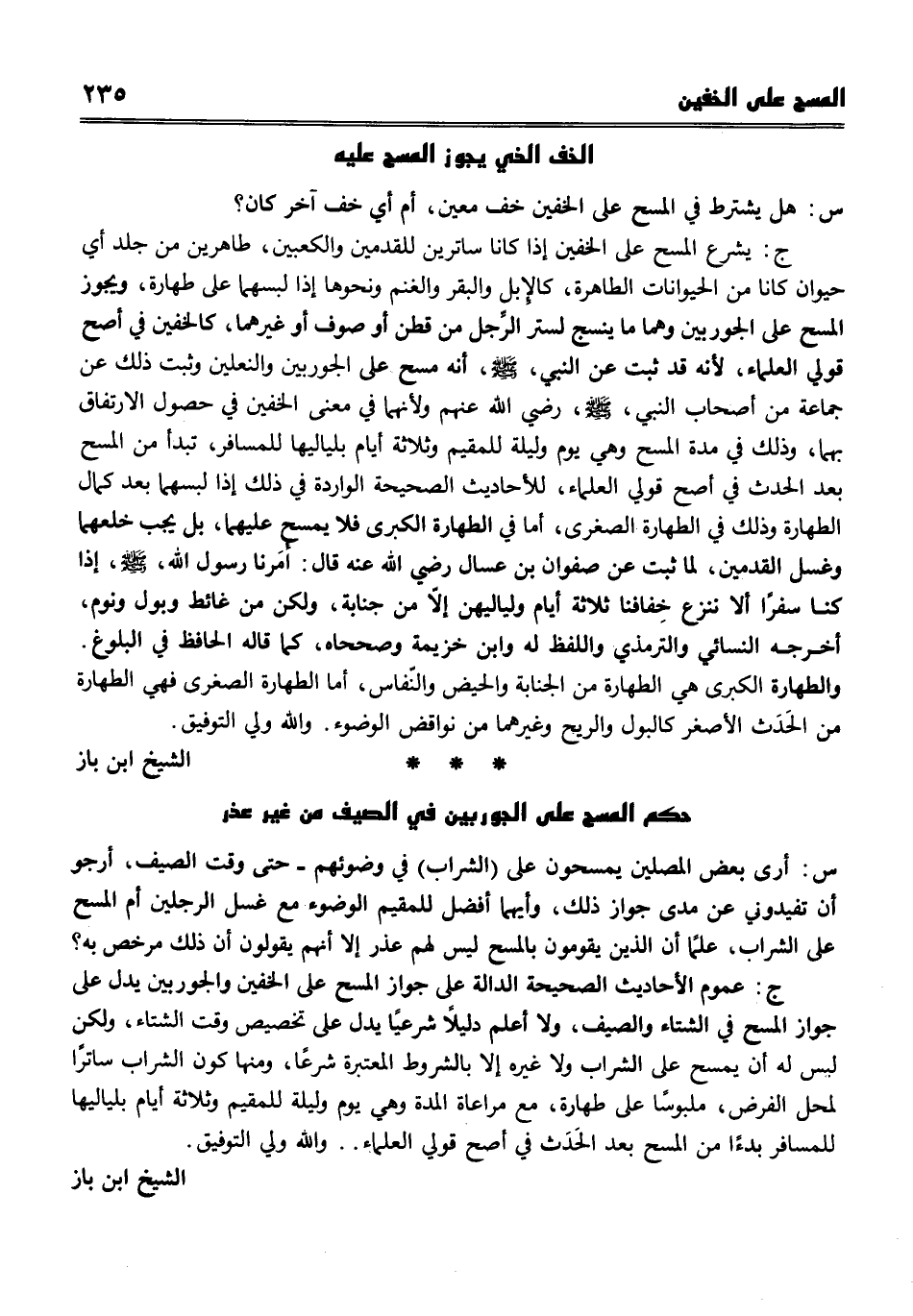 س أرى بعض المصلين يمسحون على (الشراب) في وضوئهم حتى وقت الصيف وأرجو أن تفيدوني عن مدى جواز ذلك وأيهما أفضل للمقيم الوضوء مع غسل الرجلين، أم المسح على الشراب، علما أن الذين يقومون بالمسح ليس لهم عذر إلا أنهم يقولون إن ذلك مرخص به؟