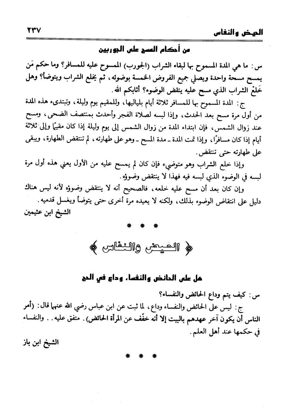 ج المدة المسوح بها للمسافر ثلاثة أيام بلياليها، وللمقيم يوم وليلة، وتبتدئ هذه المدة من أول مرة مسح بعد الحدث، وإذا لبسه لصلاة الفجر وأحدث بمنتصف الضحى، ومسح عند زوال الشمس، فإن ابتداء المدة من زوال الشمس إلى يوم وليلة إذا كان مقيمًا وإلى ثلاثة أيام إذا كان مسافرًا، وإذا تمت المدة - مدة المسح - وهو على طهارته، لم تنتقض الطهارة، ويبقى على طهارته حتى تنتقض. وإذا خلع الشراب وهو متوضيء فإن كان لم يسمح عليه من الأول يعني هذه أول مرة لبسه في الوضوء الذي لبسه فيه فهذا لا ينتقض وضوؤه. وإن كان بعد أن مسح، عليه خلعه، فالصحيح أنه لا ينتقض وضوؤه لأنه ليس هناك دليل على انتقاض الوضوء بذلك، ولكنه لا يعيده مرة أخرى حتى يتوضأ ويغسل قدميه.