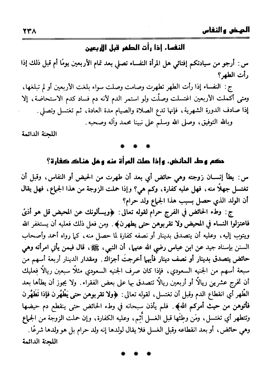 ج وطء الحائض في الفرج حرام لقوله تعالى {ويسألونك عن المحيض قل هو أذى فاعتزلوا النساء في المحيض ولا تقربوهن حتى يطهرن} . ومن فعل ذلك فعليه أن يستغفر الله ويتوب إليه، وعليه أن يتصدق بنصف دينار كفارة لما حصل منه، كما رواه أحمد وأصحاب السنن بإسناد جيد عن ابن عباس رضي الله عنهما , أن النبي صلى الله عليه وسلم , قال فيمن يأتي امرأته وهي حائض يتصدق بدينار أو نصف دينار، فأيهما أخرجتَ أجزاك. ومقدار الدينار أربعة أسهم من سبعة أسهم من الجنيه السعودي , فإذا كان صرف الجنيه السعودي مثلا سبعين ريالا فعليك أن تخرج عشرين ريالا أو أربعين ريالا تتصدق بها على بعض الفقراء. ولا يجوز أن يطأها بعد الطهر أي انقطاع الدم وقبل أن تغتسل لقوله تعالى {ولا تقربوهن حتى يطهرن فإذا تطهرن فأتوهن من حيث أمركم الله} . فلم يأذن سبحانه في وطء الحائض حتى ينقطع دم حيضها وتتطهر أي تغتسل , ومن وطأها قبل الغسل أثِم وعليه الكفارة وإن حملت الزوجة من الجماع وهي حائض أو بعد انقطاعه وقبل الغسل فلا يقال لولدها أنه ولد حرام بل هو ولد شرعاً.