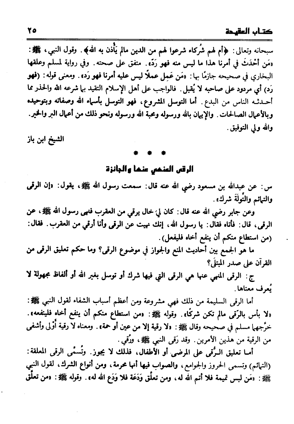 ج الرقى المنهي عنها هي الرقى التي فيها شرك أو توسل بغير الله أو ألفاظ مجهولة لا يُعرف معناها. أما الرقى السليمة من ذلك فهي مشروعة ومن أعظم أسباب الشفاء لقول النبي صلى الله عليه وسلم " لا بأس بالرقى ما لم تكن شركا "، وقوله صلى الله عليه وسلم "من استطاع منكم أن ينفع أخاه فلينفعه "، خرجهما مسلم في صحيحه، وقال صلى الله عليه وسلم " لا رقية إلا من عين أو حمة ". ومعناه لا رقية أولى وأشفى من الرقية من هذين الأمرين وقد رَقى النبي صلى الله عليه وسلم ورُقي. أما تعليق الرُّقى على المرضى أو الأطفال، فذلك لا يجوز. وتسمى الرقى المعلقة (التمائم) وتسمى الحروز والجوامع، والصواب فيها أنها محرمة، ومن أنواع الشرك، لقول النبي صلى الله عليه وسلم " من لبس تميمة فلا أتم الله له، ومن تعلق وَدَعَة فلا وَدَع الله له "، وقوله صلى الله عليه وسلم "من تعلق