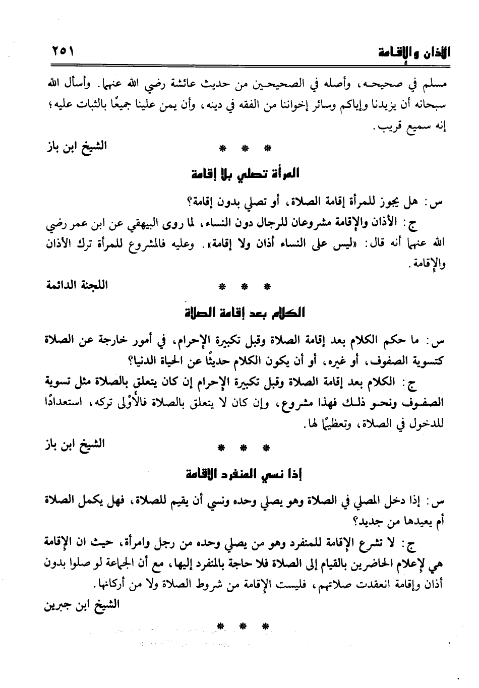 س هل يجوز للمرأة إقامة الصلاة، أو تصلي بدون إقامة؟