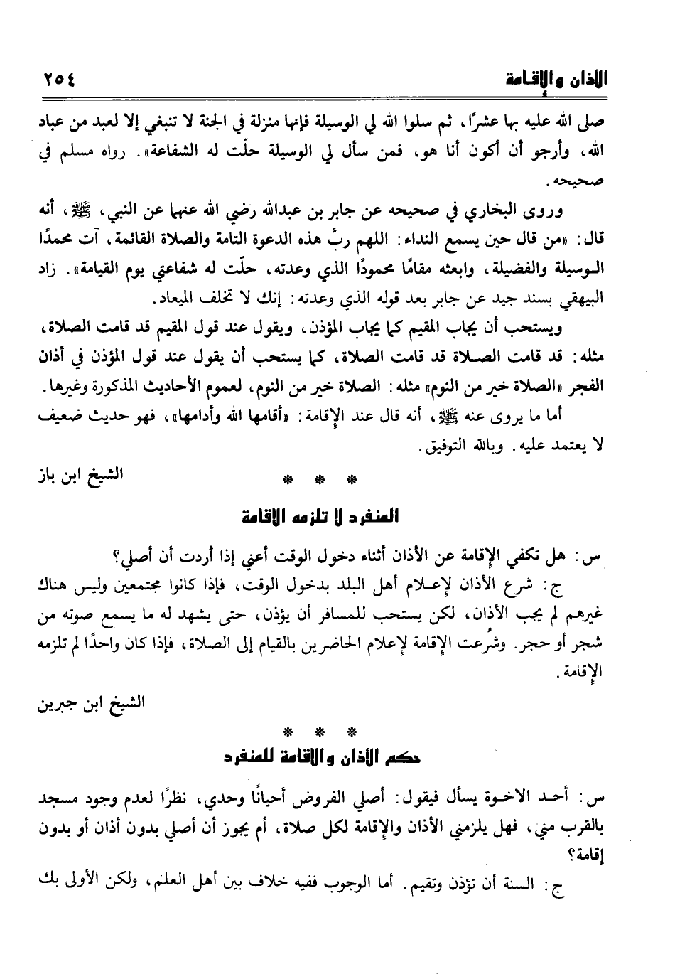 صلى الله عليه بها عشرا ثم سلوا الله لي الوسيلة فإنها منزلة في الجنة لا تنبغي إلا لعبد من عباد الله، وأرجو أن أكون أنا هو، فمن سأل لي الوسيلة حلت له الشفاعة ". أخرجه مسلم في صحيحه، وروى البخاري في صحيحه عن جابر بن عبد الله رضي الله عنهما قال قال رسول الله صلى الله عليه وسلم " من قال حين يسمع النداء اللهم رب هذه الدعوة التامة والصلاة القائمة آت محمدا الوسيلة والفضيلة وابعثه مقاما محمودا الذي وعدته، حلت له شفاعتي يوم القيامة ". زاد البيهقي بسند جيد عن جابر بعد قوله الذي وعدته إنك لا تخلف الميعاد. ويستحب أن يجاب المقيم كما يجاب المؤذن، ويقول عند قول المقيم قد قامت الصلاة، مثله قد قامت الصلاة قد قامت الصلاة، كما يستحب أن يقول عند قول المؤذن في أذان الفجر " الصلاة خير من النوم " مثله الصلاة خير من النوم، لعموم الأحاديث المذكورة وغيرها. أما ما يروى عنه صلى الله عليه وسلم أنه قال عند الإقامة " أقامها الله وأدامها " فهو حديث ضعيف لا يعتمد عليه. وبالله التوفيق.