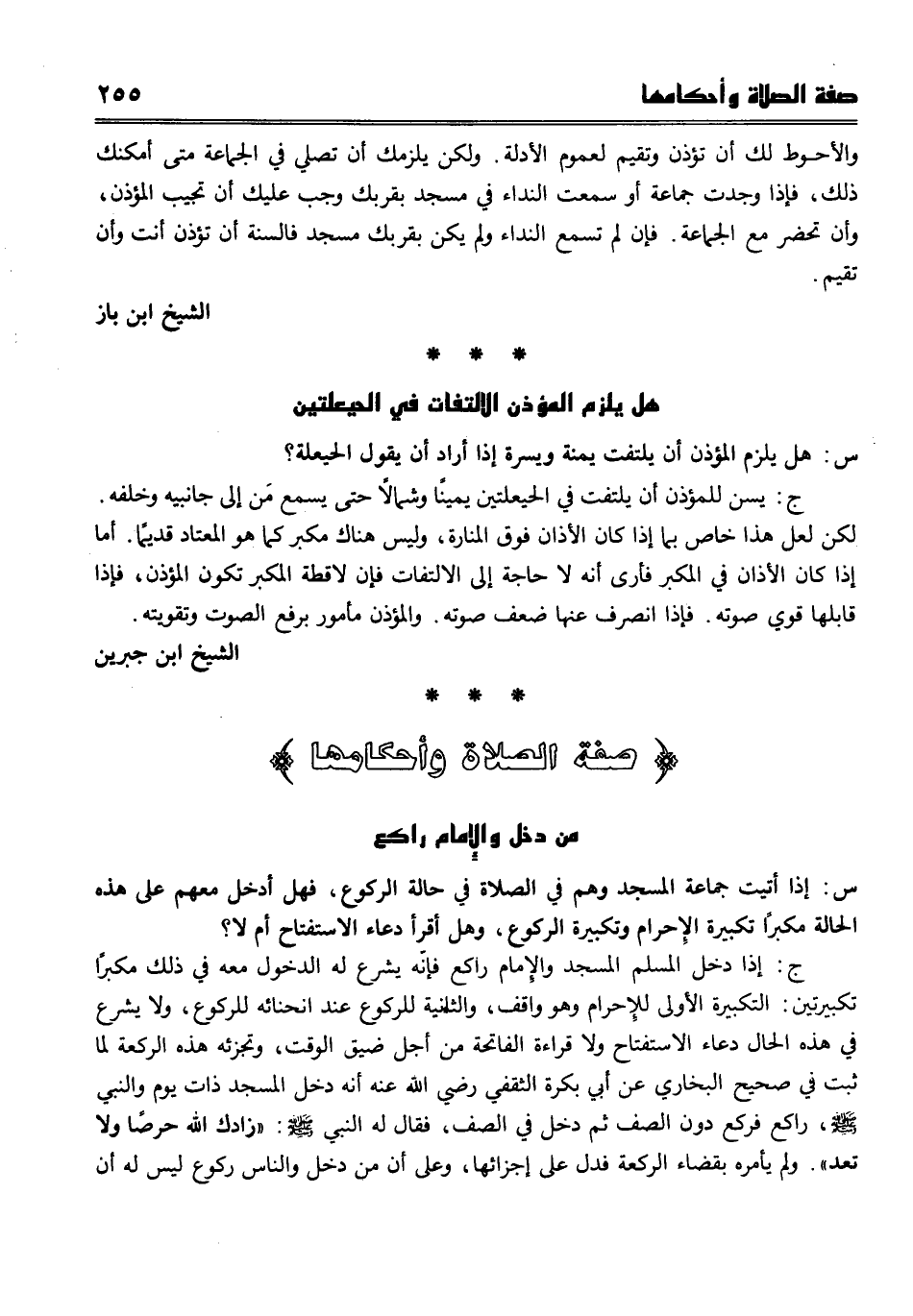 ج يسن للمؤذن أن يلتفت في الحيعلتين يميناً وشمالاً حتى يسمع مَن إلى جانبيه وخلفه. لكن لعل هذا خاص بما إذا كان الأذان فوق المنارة، وليس هناك مكبر كما هو المعتاد قديماً. أما إذا كان الأذان في الكبر فأرى أنه لا حاجة إلى الالتفات فإن لا قطة الكبر تكون المؤذن، فإذا قابلها قوي صوته. فإذا انصرف عنها ضعف صوته. والمؤذن مأمور برفع الصوت وتقويته.