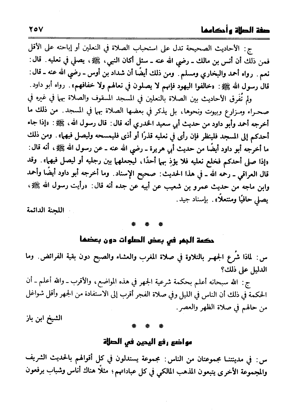 ج الأحاديث الصحيحة تدل على استحباب الصلاة في النعلين، أو إباحية ذلك على الأقل فمن ذلك أن أنس بن مالك رضي الله عنه سئل أكان النبي صلى الله عليه وسلم يصلي في نعليه؟ قال نعم، رواه أحمد والبخاري ومسلم. ومن ذلك أيضاً أن شداد بن أوس رضي الله عنه قال قال رسول الله صلى الله عليه وسلم " خالفوا اليهود فإنهم لايصلون في نعالهم ولاخفافهم " رواه أبو داود. ولم تُفَرق الأحاديث بين الصلاة بالنعلين في المسجد المسقوف والصلاة بهما في غيره من صحراء ومزارع وبيوت ونحوها، بل يذكر في بعضها الصلاة بهما في المسجد، من ذلك ما أخرجه أحمد وأبو داود من حديث أبي سعيد الخدري أنه قال قال رسول الله صلى الله عليه وسلم " إذا جاء أحدكم إلى المسجد فلينظر فإن رأى في نعليه قذراً أو أذى فليمسحه وليصل فيهما ". ومن ذلك ما أخرجه أبو داود أيضاً من حديث أبي هريرة رضي الله عنه عن رسول الله صلى الله عليه وسلم أنه قال " إذا صلى أحدكم فخلع نعليه فلا يؤذِ بهما أحداً ليجعلهما بين رجليه أو ليصل فيهما ". وقد قال العراقي رحمه الله في هذا الحديث صحيح الإسناد، وما أخرجه أبو داود أيضاً وأحمد وابن ماجه من حديث عمرو بن شعيب عن أبيه عن جده أنه قال " رأيت رسول الله صلى الله عليه وسلم يصلي حافياً ومنتعلاً ". بإسناد جيد.