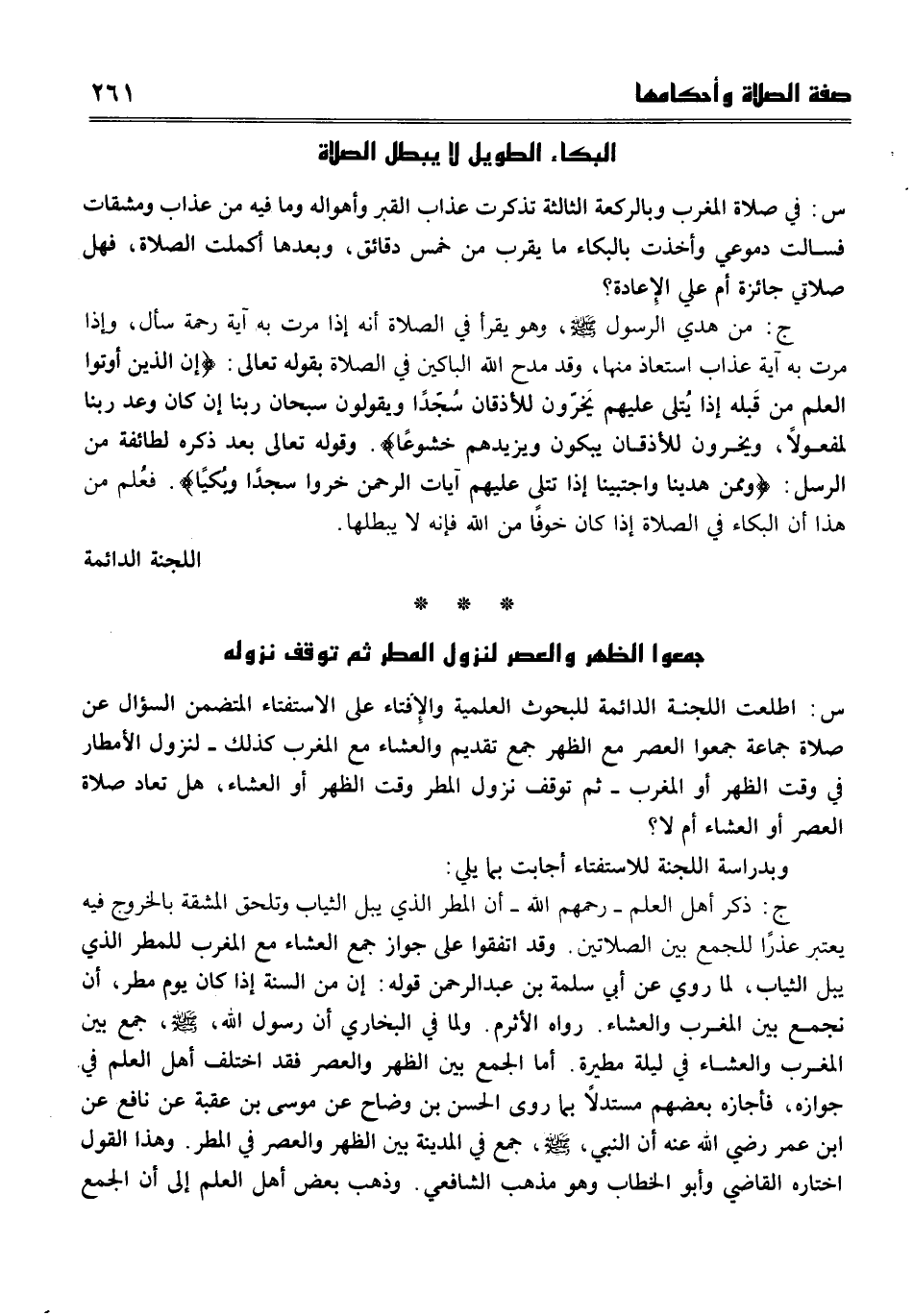 س اطلعت اللجنة الدائمة للبحوث العلمية والإفتاء على الاستفتاء المتضمن السؤال عن صلاة جماعة جمعوا العصر مع الظهر جمع تقديم والعشاء مع المغرب كذلك - لنزول الأمطار في وقت الظهر أو المغرب - ثم توقف نزول المطر وقت الظهر أو العشاء، هل تعاد صلاة العصر أو العشاء أم لا؟