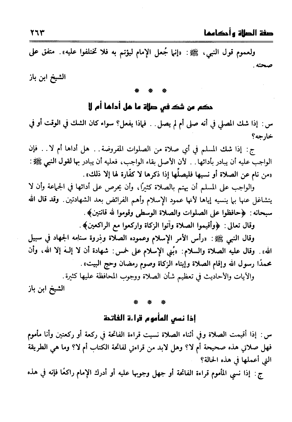 ج إذا شك المسلم في أي صلاة من الصلوات المفروضة، هل أداها أم لا؟ فإن الواجب عليه أن يبادر بأدائها، لأن الأصل بقاء الواجب فعليه أن يبادر بها لقول النبي صلى الله عليه وسلم " من نام عن الصلاة أو نسيها فليصلها إذا ذكرها لا كفارة لها إلا ذلك ". الواجب على المسلم أن يهتم بالصلاة كثيرًا، وأن يحرص على أدائها في الجماعة، وأن لا يتشاغل عنها بما ينسيه إياها؛ لأنها عمود الإسلام وأهم الفرائض بعد الشهادتين وقد قال الله سبحانه {حَافِظُوا عَلَى الصَّلَوَاتِ وَالصَّلاةِ الْوُسْطَى وَقُومُوا لِلَّهِ قَانِتِينَ} . وقال تعالى {وَأَقِيمُوا الصَّلاةَ وَآتُوا الزَّكَاةَ وَارْكَعُوا مَعَ الرَّاكِعِينَ} . وقال النبي صلى الله عليه وسلم " رأس الأمر الإسلام وعموده الصلاة وذِروة سنامه الجهاد في سبيل الله ". وقال عليه الصلاة والسلام " بُني الإسلام على خمس شهادة أن لا إله إلا الله وأن محمدا رسول الله وإقام الصلاة وإيتاء الزكاة وصوم رمضان وحج البيت ". والآيات والأحاديث في تعظيم شأن الصلاة ووجوب المحافظة عليها كثيرة.