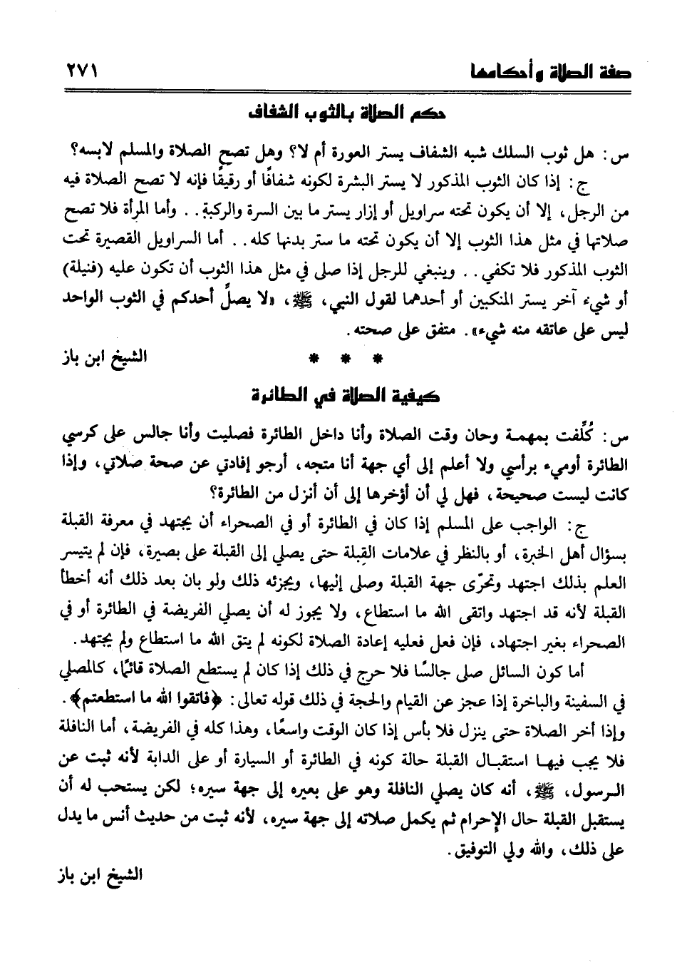 ج الواجب على المسلم إذا كان في الطائرة أو في الصحراء أن يجتهد في معرفة القبلة بسؤال أهل الخبرة، أو بالنظر في علامات القبلة حتى يصلي إلى القبلة على بصيرة، فإن لم يتيسر العلم بذلك اجتهد وتحرّى جهة القبلة وصلى إليها، ويجزئه ذلك ولو بان بعد ذلك أنه أخطأ لأنه قد اجتهد واتقى الله ما استطاع ولا يجوز له أن يصلي الفريضة في الطائرة أو في الصحراء بغير اجتهاد فإن فعل فعليه إعادة الصلاة لكونه لم يتق الله ما استطاع ولم يجتهد. أما كون السائل صلى جالسا فلا حرج في ذلك إذا كان لم يستطع الصلاة قائما، كالمصلي في السفينة والباخرة اذا عجز عن القيام والحجة في ذلك قوله تعالى {فَاتَّقُوا اللَّهَ مَا اسْتَطَعْتُمْ} . وإذا أخر الصلاة حتى ينزل فلا بأس إذا كان الوقت واسعًا، وهذا كله في الفريضة، أما النافلة فلا يجب فيها استقبال القبلة حالة كونه في الطائرة أو السيارة أو على الدابة لأنه ثبت عن الرسول صلى الله عليه وسلم أنه كان يصلي النافلة وهو على بعيره إلى جهة سيره. لكن يستحب له أن يستقبل القبلة حال الإحرام ثم يكمل صلاته إلى جهة سيره، لأنه ثبت من حديث أنس ما يدل على ذلك، والله ولي التوفيق.