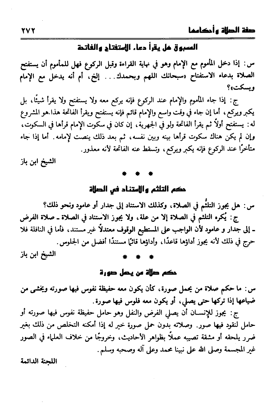 ج يكره التلثم في الصلاة إلا من علة، ولا يجوز الاستناد في الصلاة - صلاة الفرض - إلى جدار أو عمود، لأن الواجب على المستطيع الوقوف معتدلاً غير مستند، فأما النافلة فلا حرج في ذلك لأنه يجوز أداؤها قاعدًا، وأداؤها قائمًا أفضل من الجلوس.