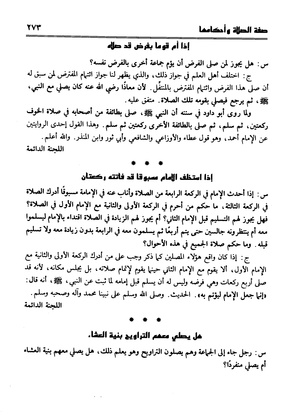 ج اختلف أهل العلم في جواز ذلك، والذي يظهر لنا جواز ائتمام المفترض لمن سبق له أن صلى هذا الفرض وائتمام المفترض بالمتنفّل. لأن معاذًا رضي الله عنه كان يصلي مع النبي ثم يرجع فيصلي بقومه تلك الصلاة. متفق عليه. ولما روى أبو داود في سننه أن النبي صلى الله عليه وسلم صلى بطائفة من أصحابه في صلاة الخوف ركعتين، ثم سلم، ثم صلى بالطائفة الأخرى ركعتين ثم سلم. وهذا القول إحدى الروايتين عن الإمام أحمد، وهو قول عطاء والأوزاعي والشافعي وأبي ثور وابن المنذر. والله أعلم.