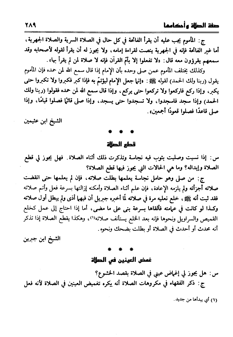 ج من صلى وهو حامل نجاسة يعلمها بطلت صلاته، فإن لم يعلمها حتى انقضت صلاته أجزأته ولم يلزمه الاعادة، فإن علم أثناء الصلاة وأمكنه إزلتها بسرعة فعل وأتم صلاته فقد ثبت أنه صلى الله عليه وسلم خلع نعليه مرة في صلاته لما أخبره جبريل أن فيهما أذى ولم يبطل أول صلاته وكذا لو كانت في عمامته فألقها بسرعة بنى على ما مضى أما إذا احتاج إلى عمل كخلع القميص والسراويل ونحوها فإنه بعد الخلع يستأنف صلاته (1) - أي يبدأها من جديد - وهكذا يقطع الصلاة إذا تذكر أنه محدث في أو أحدث في الصلاة أو بطلت بضحك ونحوه.