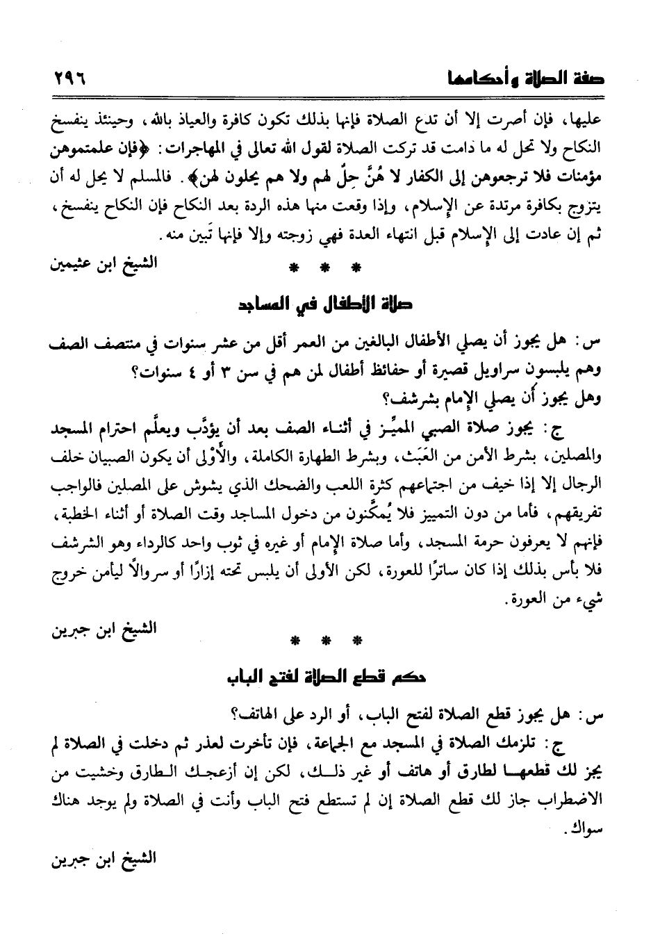 عليها، فإن أصرت إلا أن تدع الصلاة فإنها بذلك تكون كافرة والعياذ بالله، وحينئذ ينفسخ النكاح ولا تحل له مادامت قد تركت الصلاة لقول الله تعالى في المهاجرات {فَإِنْ عَلِمْتُمُوهُنَّ مُؤْمِنَاتٍ فَلا تَرْجِعُوهُنَّ إِلَى الْكُفَّارِ لا هُنَّ حِلٌّ لَهُمْ وَلا هُمْ يَحِلُّونَ لَهُن} . فالمسلم لا يحل له أن يتزوج بكافرة مرتدة عن الإسلام، وإذا وقعت منها هذه الردة بعد النكاح فإن النكاح ينفسخ، ثم إن عادت إلى الإسلام قبل انتهاء العدة فهي زوجته وإلا فإنها تَبين منه.